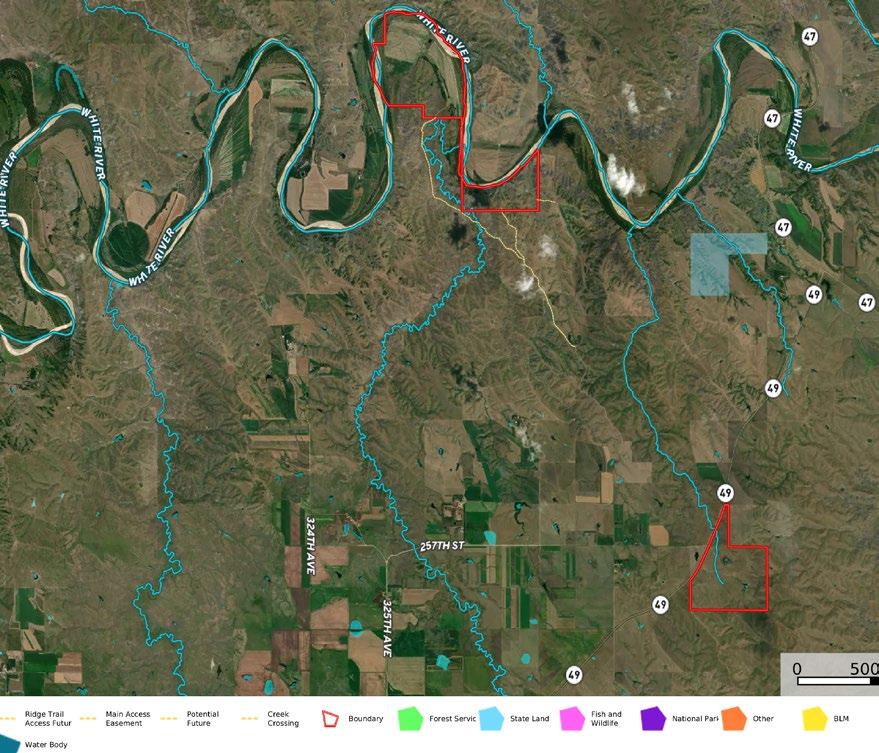 Nestled in a picturesque landscape, White River Hunting Retreat & Production Ground boasts rolling hills and open pastures. The area’s natural beauty offers breathtaking views and a tranquil environment, making it an ideal setting for all your hunting, sporting, leisure, and production needs. This property offers over 5 miles of White River frontage and includes miles of native grasslands interspersed with cropland and food plots for wildlife to winter. One can hunt trophy-grade whitetail, mule deer, pheasant, grouse, turkey, and prairie chicken. The grass pasture provides quality soil for grazing and hay production.