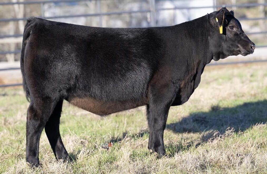 An outcross breeding piece by the $180,000 Hummel South America back to the foundation Chloe female in the Ingram Angus program who was the $150,000 one-half interest and top-selling bred heifer of the 2021 Your Maternal Source Sale for a $300,000 valuation, Coleman Chloe 034.