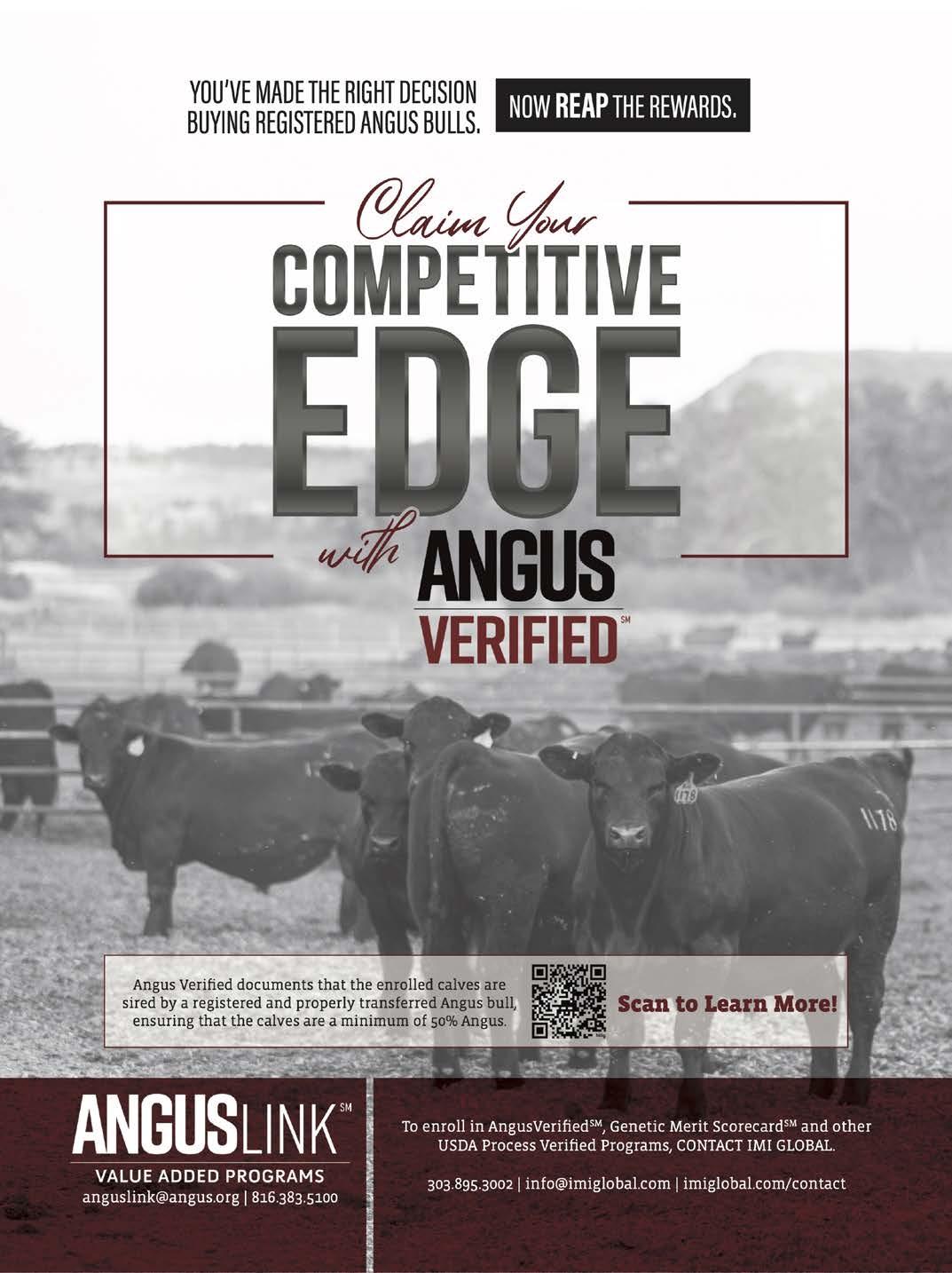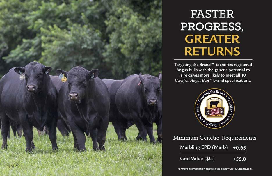 EPDs contained in the hard copy of this sale book were current as of print date. Digital versions of this sale book can be viewed online at www.angus.org and will have EPDs updated every Friday with the exception of EPD references in footnotes and photos. Any PDF downloads from the website will contain EPDs current as of the date downloaded. References: American Angus Association®, AHIR®, AngusLinkSM, CAB®, Pathfinder®.