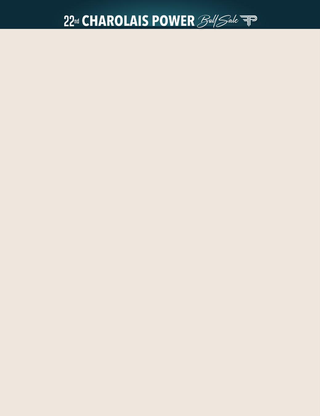 10 Yearling Bulls Lot 7 Lot 8 Lot 10 MVY HICKORY 47H DYV PAYNES CLEARLY 29Z WHITECAP MR BLADE 5B CSS SIR CLEARCUT 29U MVY CUTE SECRETS 45A DYV PAYNES SNICKERS 16S MVY CUTE SECRETS 56T DYV PAYNES PAIGE 12P JWX WYOMING 1730Z CSS LADY NAVIGATOR 84S HTA ICE 19X DBAR LIVE WIRE 423P JWX FIFTY SHADES 706Z CSS SIR CLEAR CUT 14N 7 MC864219 | DYV 32L | 3-Feb-23 | Polled | White FOOTPRINTS SIR 32L BWT Perf 90 Nov 20/23 wt Act WW Sept 7/23 Jan 28/24 wt 1084 734 1304 BW -0.8 CE 8.7 EPDs YW 100 WW 49 MWWT 44 Milk 19 Sale Day Wt Scrotal Disposition MVY HICKORY 47H DYV PAYNES DANICA 14G WHITECAP MR BLADE 5B LT SIGNATURE 6136 PLD MVY CUTE SECRETS 45A DYV PAYNES DANICA 19D MVY CUTE SECRETS 56T DYV PAYNES CUTIE PIE 18U JWX WYOMING 1730Z LT BRENDA 2225 PLD HTA ICE 19X JWX REDNECK CRAZY 26A JWX FIFTY SHADES 706Z LT SUNDANCE 2251 PLD 8 MC864226 | DYV 39L | 14-Feb-23 | Polled | White FOOTPRINTS SIR 39L BWT Perf 84 Nov 20/23 wt Act WW Sept 7/23 Jan 28/24 wt 960 602 1200 BW -1 CE 8.6 EPDs YW 106 WW 55 MWWT 48 Milk 20 Sale Day Wt Scrotal Disposition MVY HICKORY 47H DYV PAYNES REVEALING 11Z WHITECAP MR BLADE 5B D R REVELATION 467 MVY CUTE SECRETS 45A DYV PAYNES DAKOTA 11X MVY CUTE SECRETS 56T DYV PAYNES NIFTY 13N JWX WYOMING 1730Z DR WC FOREVER LUCY 372ET HTA ICE 19X SPARROWS BIRMINGHAM 758T JWX FIFTY SHADES 706Z HOODOO SLASHER 1144 9 MC864218 | DYV 44L | 28-Feb-23 | Polled | White FOOTPRINTS SIR 44L BWT Perf 94 Nov 20/23 wt Act WW Sept 7/23 Jan 28/24 wt 866 578 1050 BW -0.7 CE 5.4 EPDs YW 95 WW 53 MWWT 49 Milk 22 Sale Day Wt Scrotal Disposition HRJ JURO 151J FOOTPRINTS FASHION 112J KAYR DEPUTY 716G DC/BHD WARLORD F2003 P HRJ RUMERHASIT 984G FOOTPRINTS FASHION 526C HRJ MISS RUMERHASIT 604D FAWCETT MISS 42W KAYR COVERGIRL 716E BHD MS MAGNUM D2509 PET HRJ DIRTY HARRY 603D SVY RUSHMORE PLD 145Y WCR COMMISSIONER 593 P BHD ARES D146 P 10 MC874076 | FPF 305L | 2-Jan-23 | Horned | White