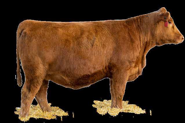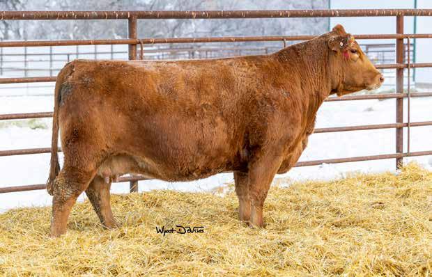 18 LOT 14 HOMOZYGOUS POLLED RED Take a good look at this one if you’ve been waiting for a red EC bred heifer! Her dam was purchased from Ivers Family Gelbvieh from the ND Golden Rule sale and has been hitting it out of the park, being named a Dam of Merit in 2020 as a result. We finally have a couple of daughters working in the herd, so we were able to wrestle this one away from Galen & Marcia to offer in this sale. These EC daughters continue to solidify their home at PHG with their fleshing ability, udder quality, and willingness to do this through drought conditions while coming home bred in the fall. Lot 14 sells bred to another new sire addition - GVC Jaw Dropper J29 - the high selling bull in the 2022 Pot of Gold sale in Colorado. This is sure to be an exciting combination! Pasture exposed to GVC Jaw Dropper J29 from 5/15 to 7/10. Ultrasound shows a 2/26/23 red 82% bull calf. RWG RIGHT COMBINATION 5506 SIRE: RWG EXACT COMBINATION 7409 RWG HADIE 3505 RWG WAR ADMIRAL 2528 SLC LORA 164Y RWG XTREME TRACTION 0521 RWG YES HADIE 1508 JRI TOP RECRUIT 254U82 DAM: IFG IVERS MISS CORA D 12 IFG IVERS B 5 SALT ET JRI TOP SECRET 253M75 ET JRI MS COCOA 254S72 NBAR NBAR HAMLEY S913 IFG IVERS MISS LIKE 601P PHG JULIE J88 LOT 14 — PHG JULIE J88 CE 10 BW 1.6 WW 68 YW 92 MK 17 TM 52 CEM 5 YG -0.16 CW 25 REA 0.46 MB 0.04 FPI 66.99 Birth Wt 84 Adj WW 690