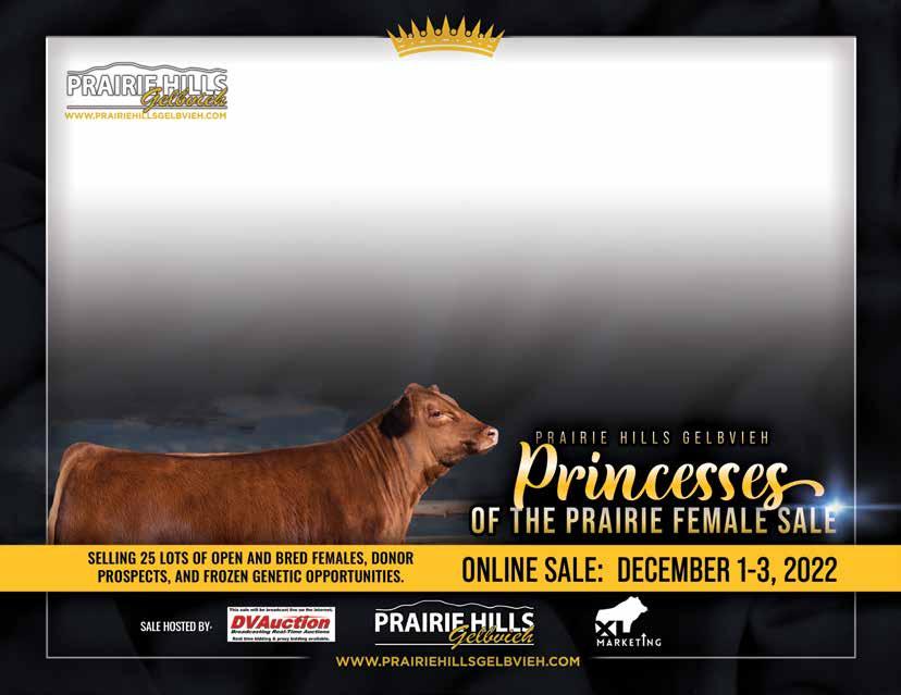 heifer in 2020 to Davidson Gelbvieh in Canada. This is a cow family that is developing a reputation around here as being broody, big middled, and easy keeping. Miss Ali combines the best of both worlds - powerful, deep, yet feminine and eye catching when she comes at you. Her paperwork is all in order as well, with EPD’s all above board. So what is she? A show heifer, or a potential donor female? Take her home and let us know, I think she could work both ways! MCCA CORNHUSKER RED 524C SIRE: PHG HAMILTON H10 CRAN FAYE F822 RWG TRACTION 7412 MCCA ZIVA Z24 CRAN CRANVIEW SANDHILLS D58 ET CRAN CRAN Y133 DVE DAVIDSON HOWARD 3E DAM: PHG MISS ALI H26 PHG MISS ALI D25 DVE DVE DAVIDSON THE GIFT 110B DVE DAVIDSON MS SECRET 44B RWG YIKES 1512 LJSA PRINCESS ALI 522R K01 | Registration #: AMGV1539589 | 2/14/2022 | Open Heifer | PB 94% Gelbvieh PHG MISS ALI K01 LOT 1 — PHG MISS ALI K01 LOT 1 CE 15 BW 0.5 WW 78 YW 113 MK 21 TM 60 CEM 7 YG -0.08 CW 43 REA 0.54 MB 0.02 FPI 75.71 Birth Wt 72 Adj WW 716
