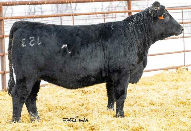 16 LOT 12 HOMOZYGOUS POLLED HOMOZYGOUS BLACK We offered a pair of E&B Plus One sired females last year as open heifers. This is the sister that was hiding in the back pen. With all the hype on Plus One and how good his daughters are, I wanted to see for myself how they would develop and offer one as a bred heifer. I think the results speak for themself here. If you’re looking for an easy fleshing, moderate, tanky female to add to your program, I’d suggest taking a hard look here at Lot 12. The grandmother to this girl is also the dam of Lot 3, so you can sure see some consistency in this cow family! To sweeten the pot, she’s got an Eminence heifer inside of her which would be eligible to sell in this sale next year! Lot 12 sells bred AI to PHG Eminence E02 for a 3/5/2023 heifer calf. Pasture exposed to LVL DLW Frontrunner 13J from 5/28/22 to 7/10/22. Ultrasound called safe to the AI date. CONNEALY CONFIDENCE PLUS SIRE: E&E PLUS ONE E&E LADY 1023 PRECISION 936 CONNEALY CONFIDENCE 0100 ELBANNA OF CONANGA 1209 E&B 1680 PRECISION 1023 E&B LADY 878 NEW DESIGN 441 PHG LEGACY D05 DAM: PHG MISS ACAPELLA G86 PHG ACAPELLA A26 WRS SILENT STAN 20S PHG PHG LINDA Y26 COLB MR XAVIER X812 PHG REDNECK LADY Y19 J22 | Registration #: AMGV1510971 | 2/27/2021 | Bred Female | 50% Balancer PHG MISS ACAPELLA J22 LOT 12 CE 15 BW -1.9 WW 61 YW 99 MK 20 TM 50 CEM 7 YG -0.14 CW 37 REA 0.77 MB 0.43 FPI 79.25 Birth Wt 74 Adj WW 630