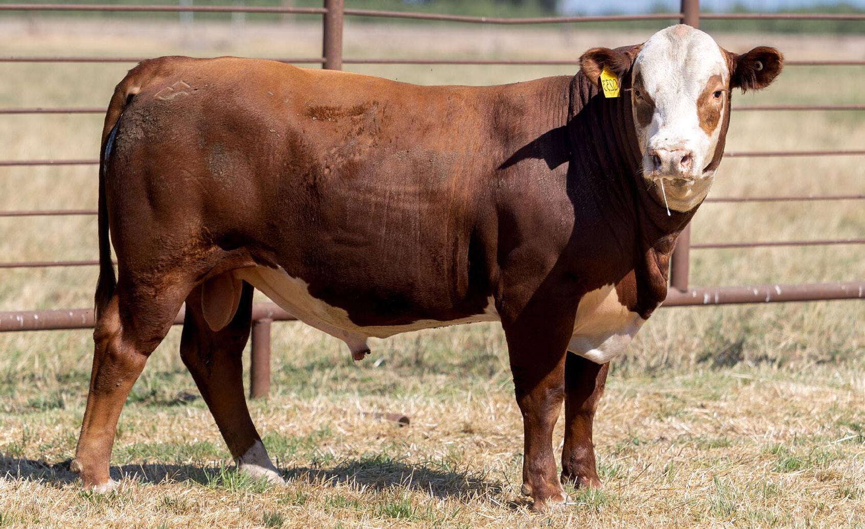 Heterozygous Polled - This dark red BR HUTTON 4030ET son is extremely athletic and big footed, and is ready to work in the hill country. Definitely adds power to any commercial program.
