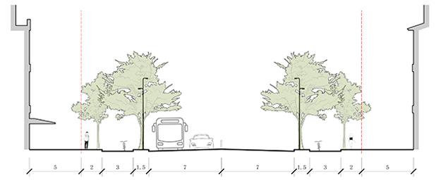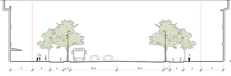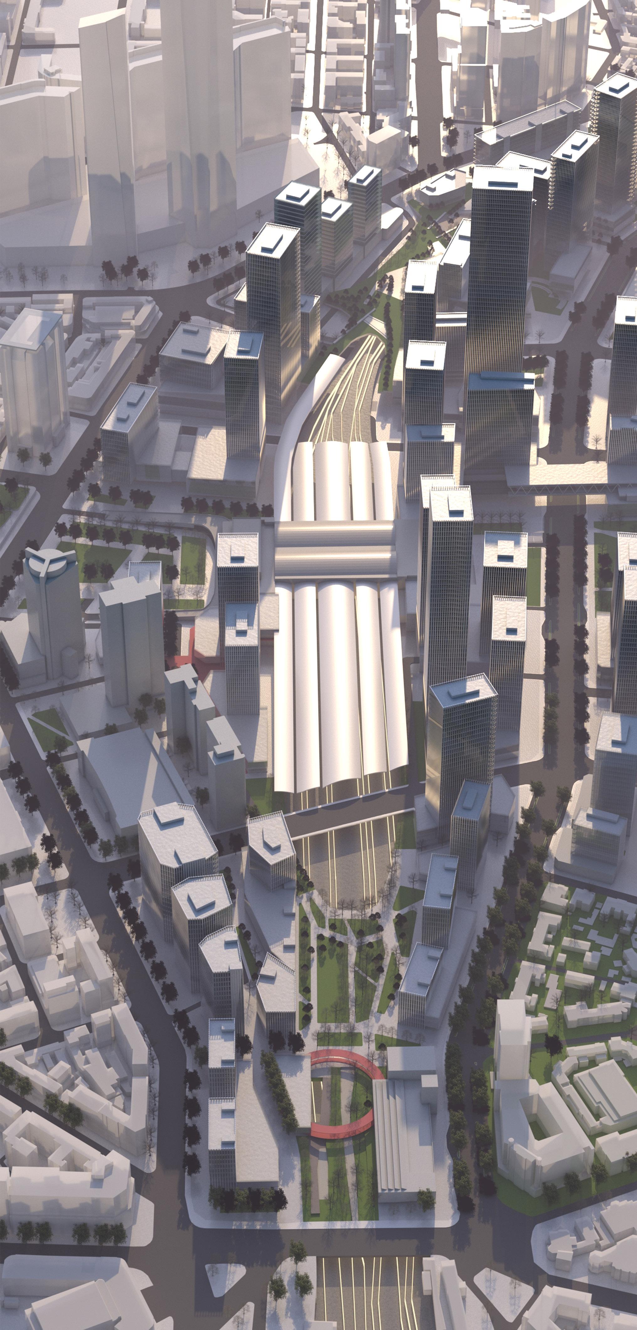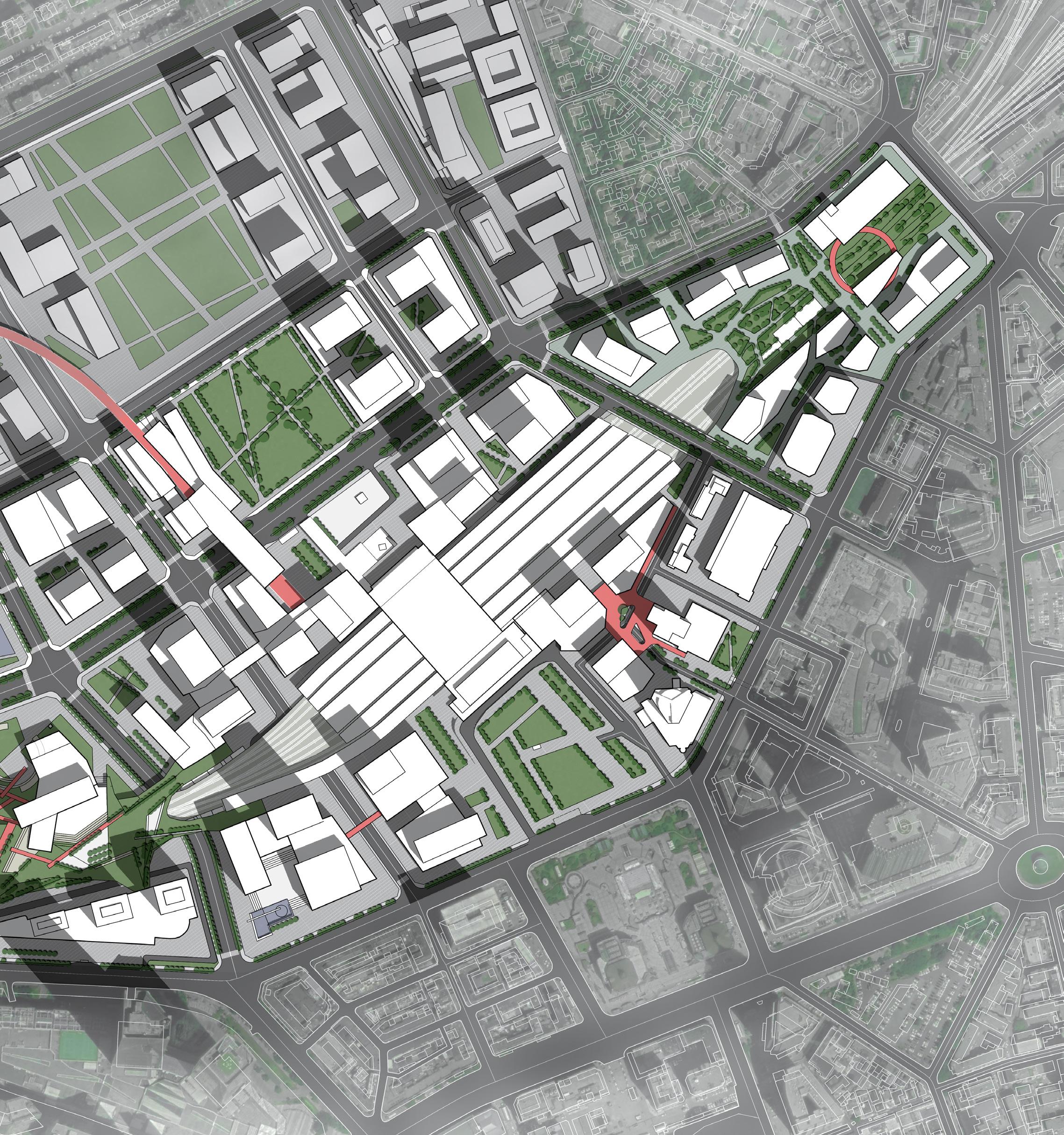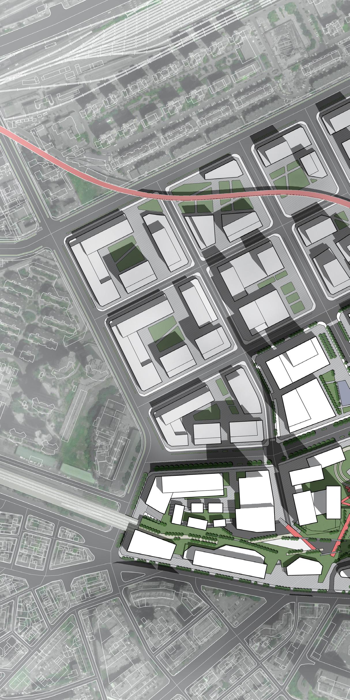 The railway tracks are covered underground, and the urban space they occupy is liberated to become public green spaces and city squares. The road that goes down through the railway tracks is connected to the underground parking lot, which relieves the squeeze of parking on urban space.