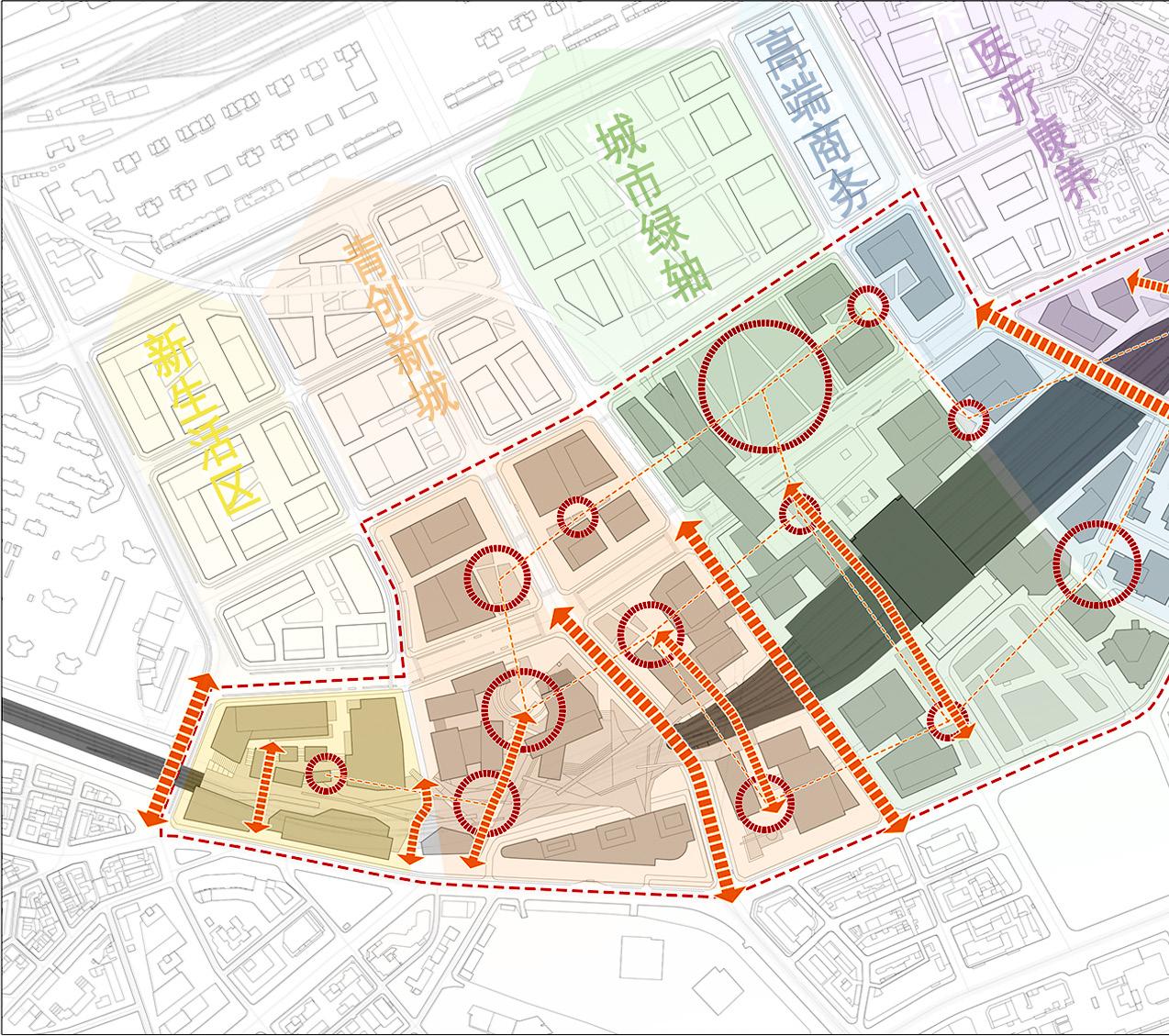 The station-railway plot will be re-divided, with the urban green axis formed by the north and south squares as the center, and the light rail station and the subway station connected to the west side, creating a young and innovative city with convenient transportation and full of vitality. A new living area with young people as the main body will be built in this area.