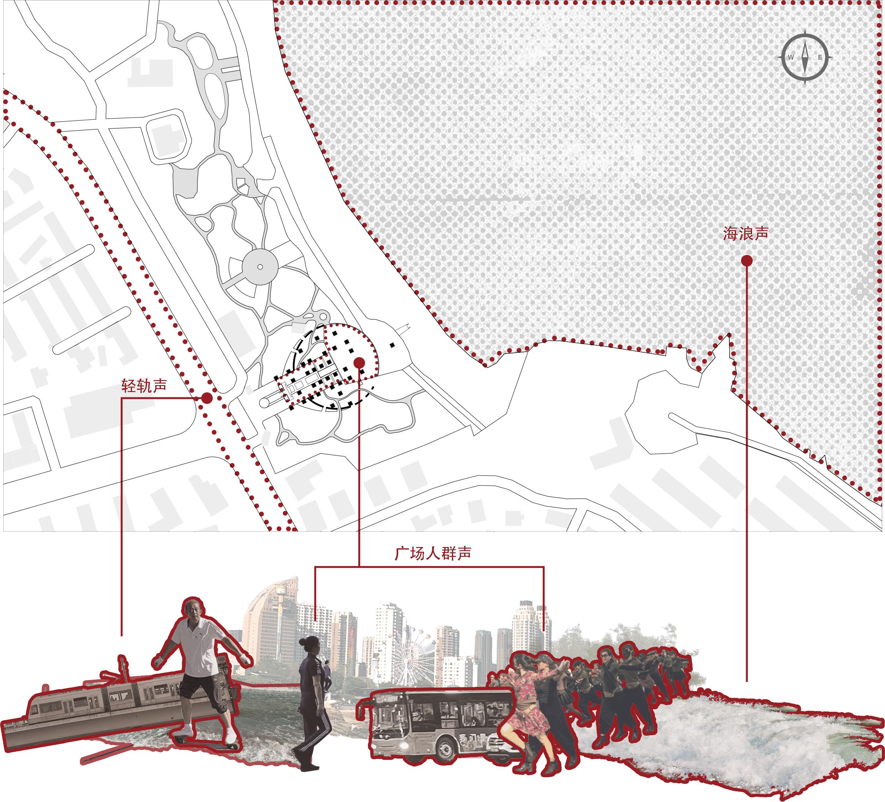 The base combines the sound of the light rail, the sound of the waves and the human voice of the crowd in the square.
