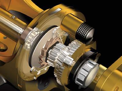 The SLG technology incorporates a dual-step pinion gear system on star drag reels that allows positive engaging at extreme high speeds. The SLG system allows for instant gear engagement when engaging from freespool to strike at speeds in excess of 50 MPH.