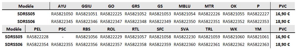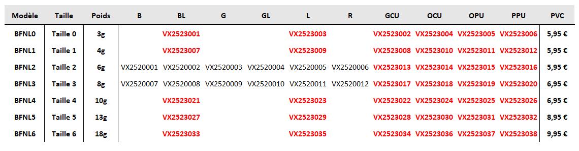 NOUVELLES TAILLES NOUVEAUX COLORIS ROUGE = NouveautéB - Black; BL - Blue; G - Gold; GCU - Green Chartreuse UV; GL - Glow; L - Purple; OCU - Orange Chartreuse UV; OPU - Orange Pearl UV; PPU - Pink Pearl UV; R - Red