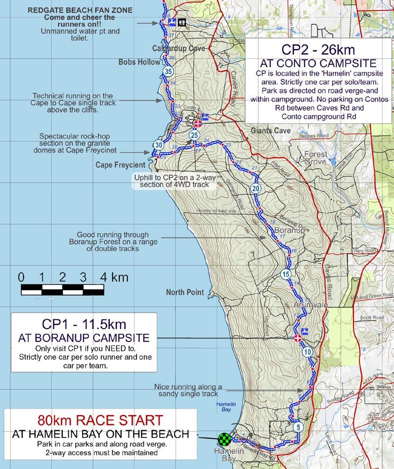 • Relay team runners: One team member (or their support crew or friends) can collect the registration items for all team members. If 80km runners cannot register on Friday please contact info@rapidascent.com.au to access late registration at the start line at Hamelin Bay between 6:00am and 7:30am on Saturday morning.