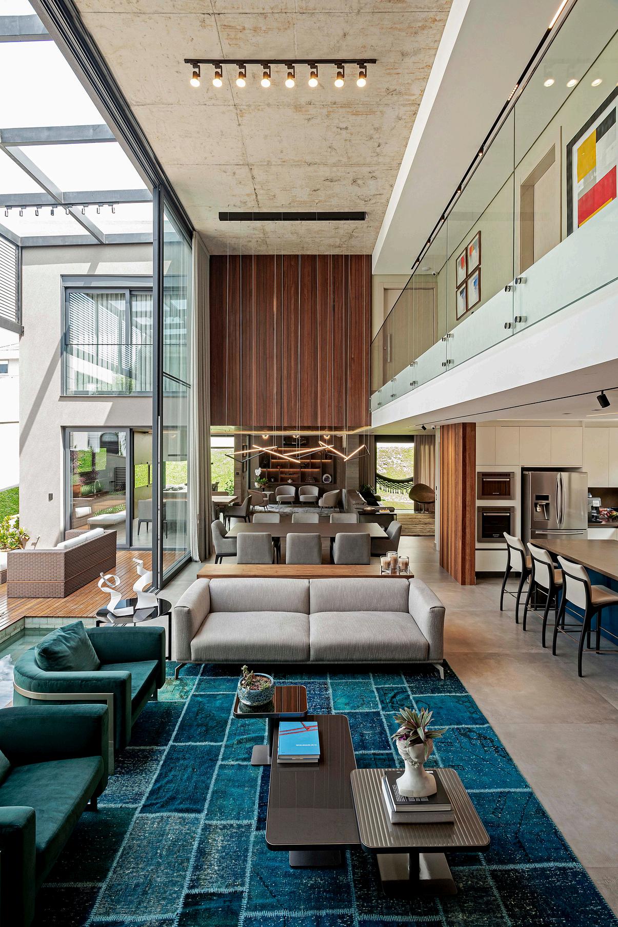 Entre os elementos que chamam a atenção, o tapete oriental patchwork tingido em azul cobalto se destaca como um dos principais pontos do projeto. Os proprietários expressaram satisfação com a harmonia das cores e materiais, ressaltando a integração dos ambientes sociais com o terreno, criando uma fluidez que estimula a convivência.