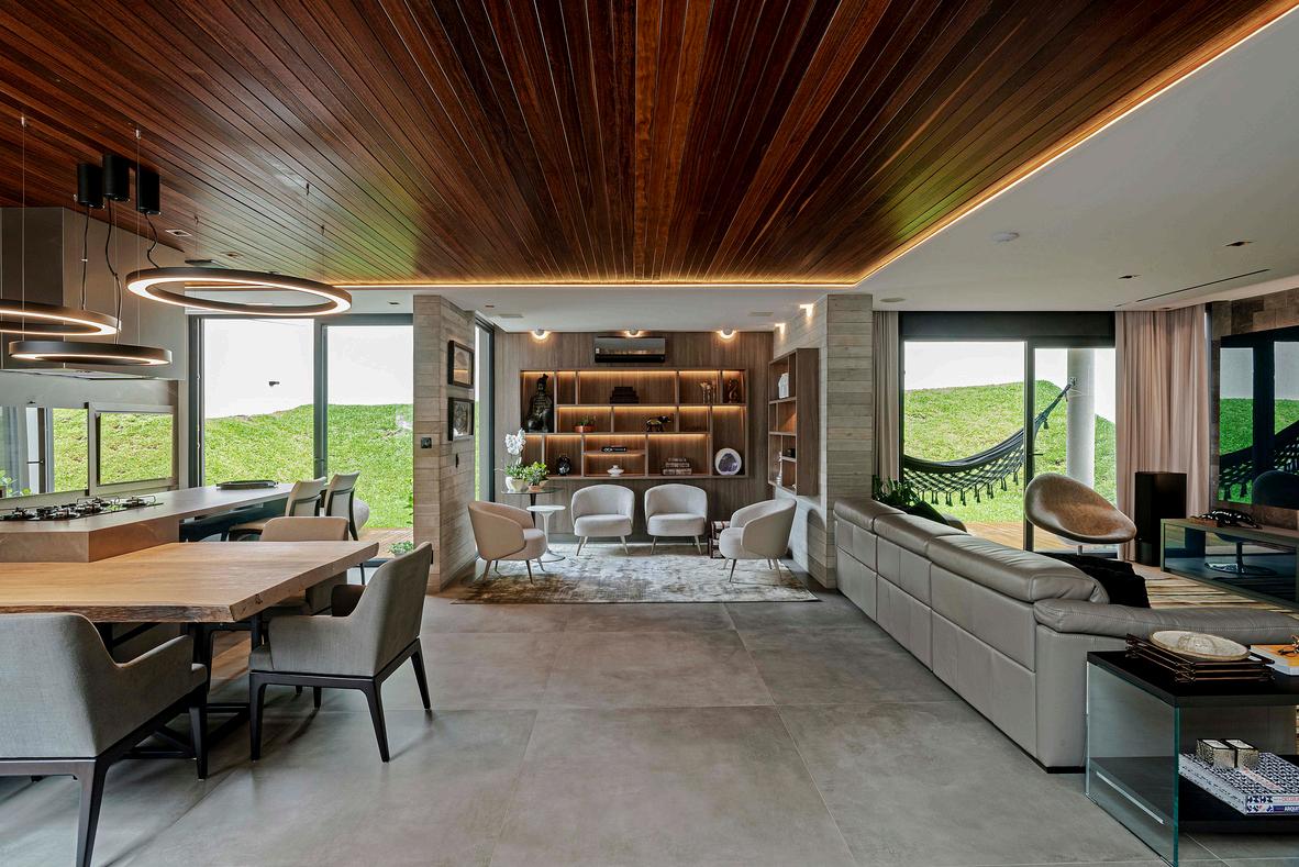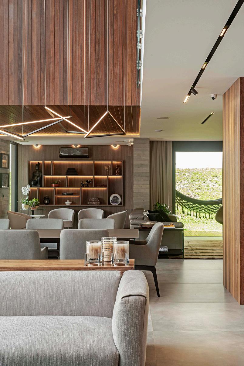 Nesta foto temos uma composição integrada com 3 espaços distintos: Lounge Library, home cinema e churrasqueira gourmet. Este projeto é privilegiado pela luz natural que destaca a mesa em madeira maciça de demolição com desenho exclusivo do escritório Maganhoto e Casagrande Na parede, réguas em cimento queimado, piso Portobello Shop 100cmx100cm concreto contrapõem com os móveis em tecidos naturais como linho e couro do sofá do home cinema Destaque para o teto em madeira natural muriacatira que juntamente com a composição das luminárias circulares em led/madeira conferem aconchego ao ambiente. 1 8