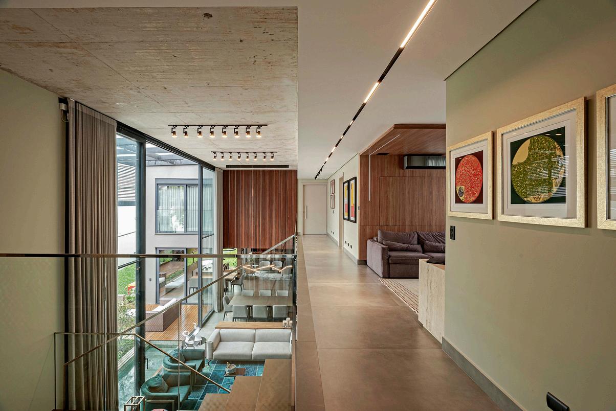 Um projeto de excelência prevê uma boa circulação, com um bom fluxograma Aqui podemos admirar o visual do é direito duplo, com acesso às suítes, sala íntima e Tv/jogos da família e escritório Todo o piso é aquecido e no teto do pé direito duplo preservamos a textura e acabamento atemporal do concreto aparente Destaque para o sistema de iluminação de embutir multispot com réguas pontuadas em led e o tradicional trilho eletrificado marca sua presença, como um dos clássicos da iluminação