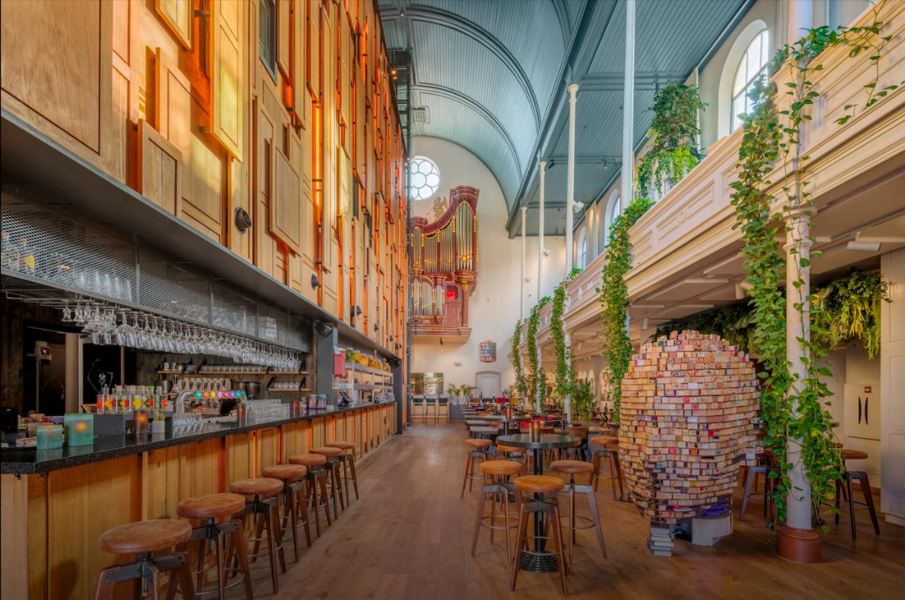 Mornings are calm and unhurried great for a slow breakfast or getting some work done with a coffee, making it a top choice for digital nomad-friendly hotels in Utrecht. Afternoons see a productive, social energy settle in. And by evening, the former church comes alive with music, cultural events, and gatherings that turn the whole space into something closer to a venue than a hotel lobby.