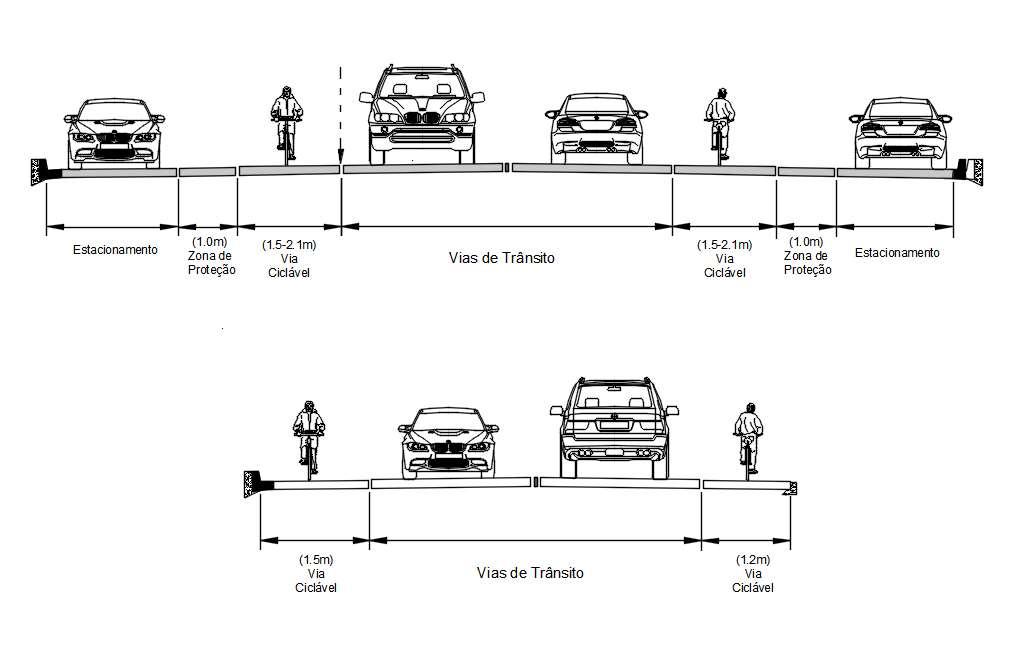 Em áreascom elevadotráfegodebicicletasesem apresençadeestacionamento.Nestecaso, preconiza-se uma largura da faixa ciclável entre 1,8 m e 2,4 m, para possibilitar que dois ciclistas andem lado a lado sem sair da faixa.