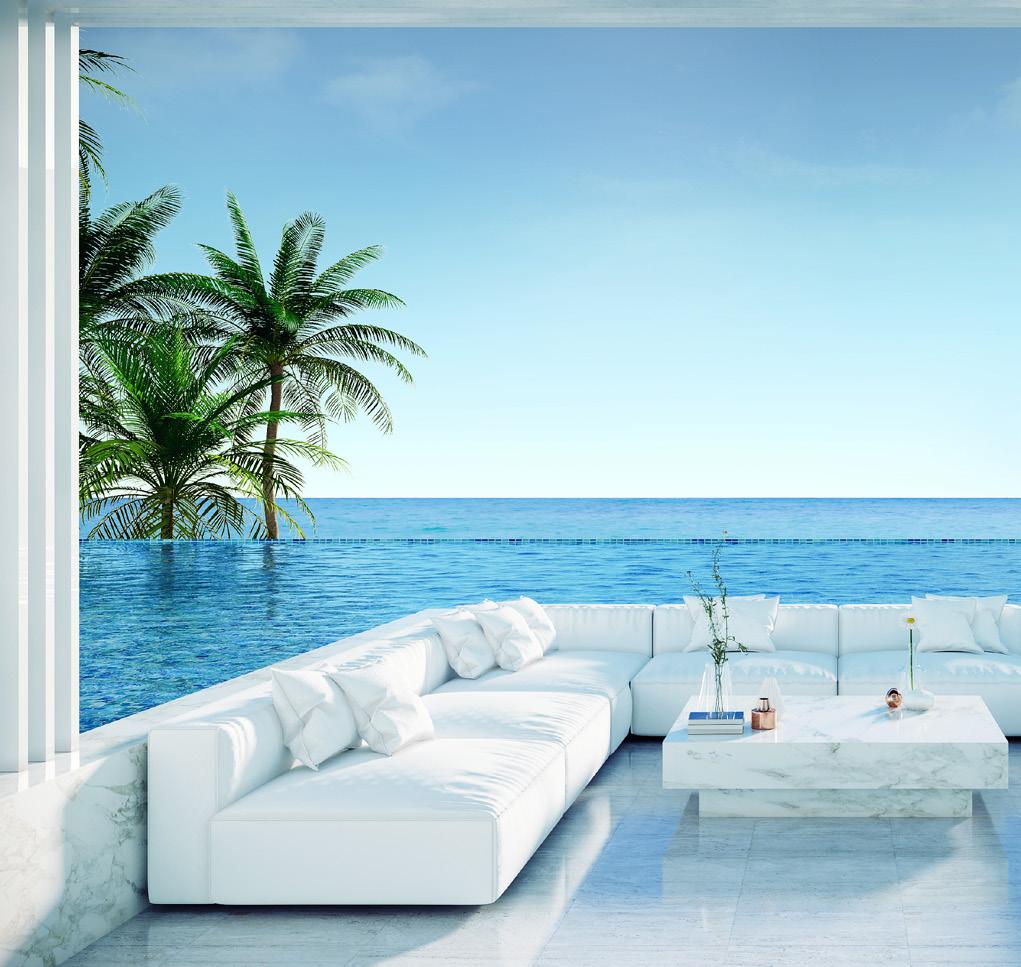 The open concept living area features floor-to-ceiling impact glass windows that frame views of the Atlantic Ocean and flood the entire interior with abundant natural light. The multi-purpose living room overlooking the pool and ocean has a designer gas fireplace with a feature wall and plenty of room to relax and unwind.