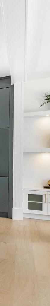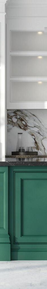 It’s widely held that choosing abovethe-counter kitchen cabinets with a lighter tone than the lower cabinets makes them recede in the viewer’s eye, opening the space by drawing the eye upward. The room appears larger and airier. By contrast, darker-colored lower cabinets ground the room by anchoring it and adding depth.