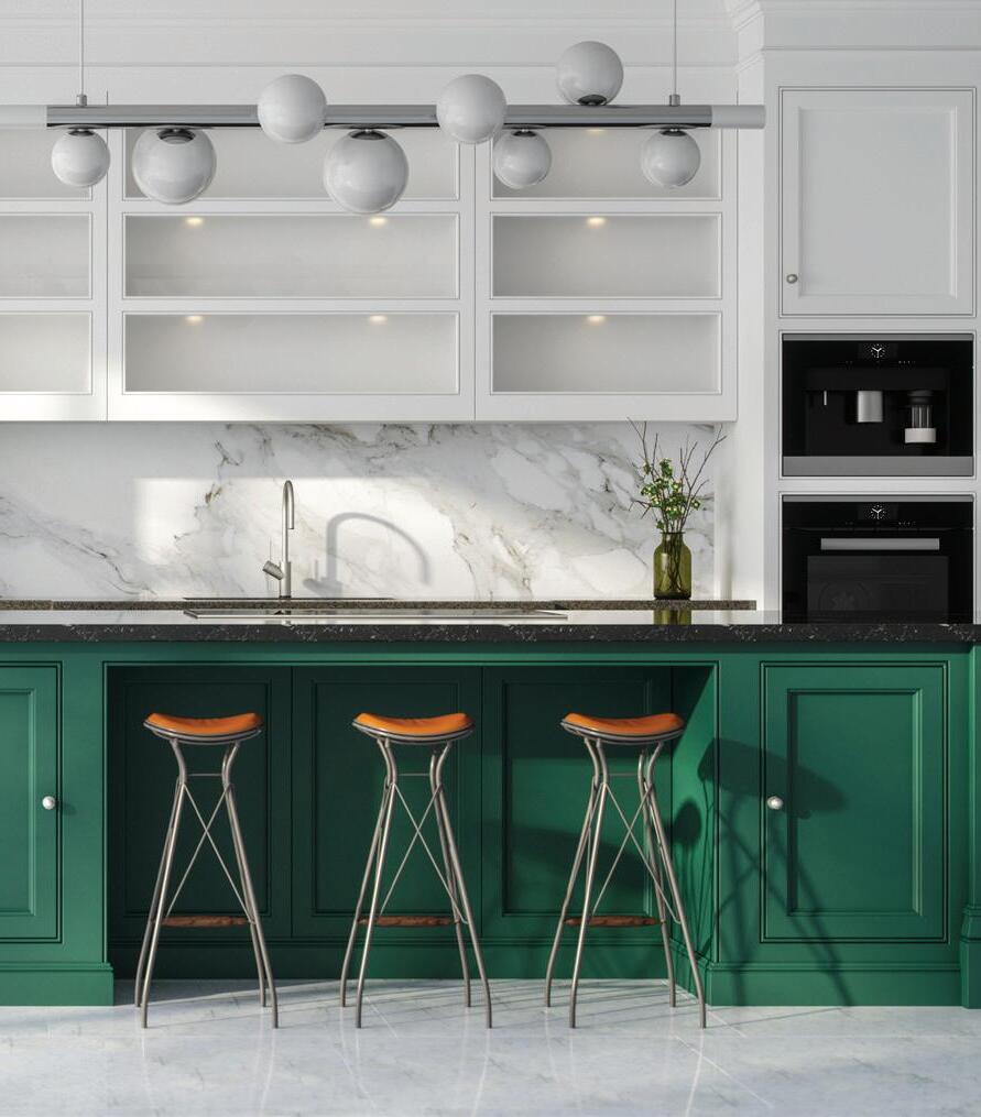 Marble or granite counters radiate classic gravitas and also add visual interest through veining patterns. A backsplash of zellige tile will add texture while working with the color scheme.