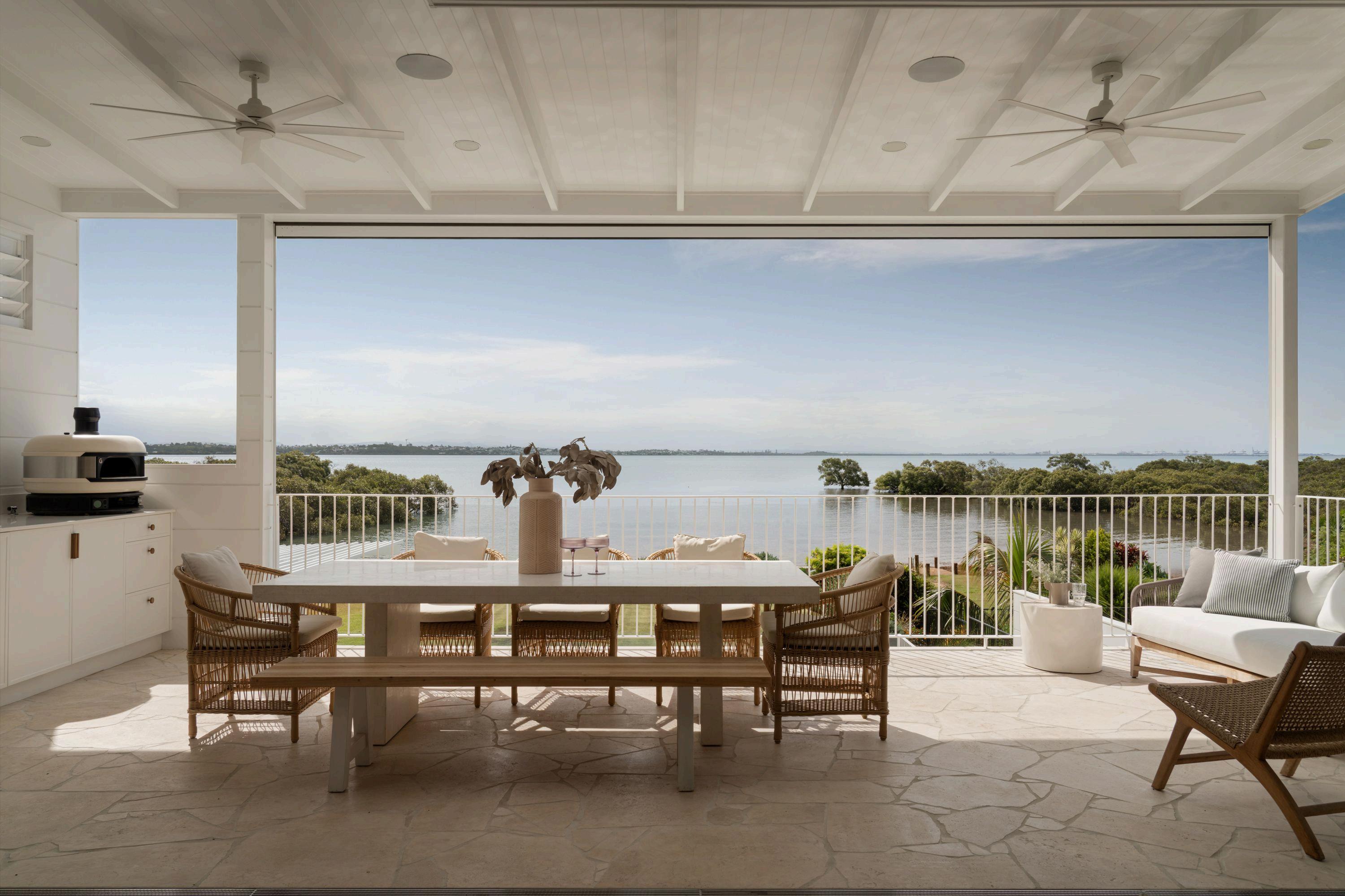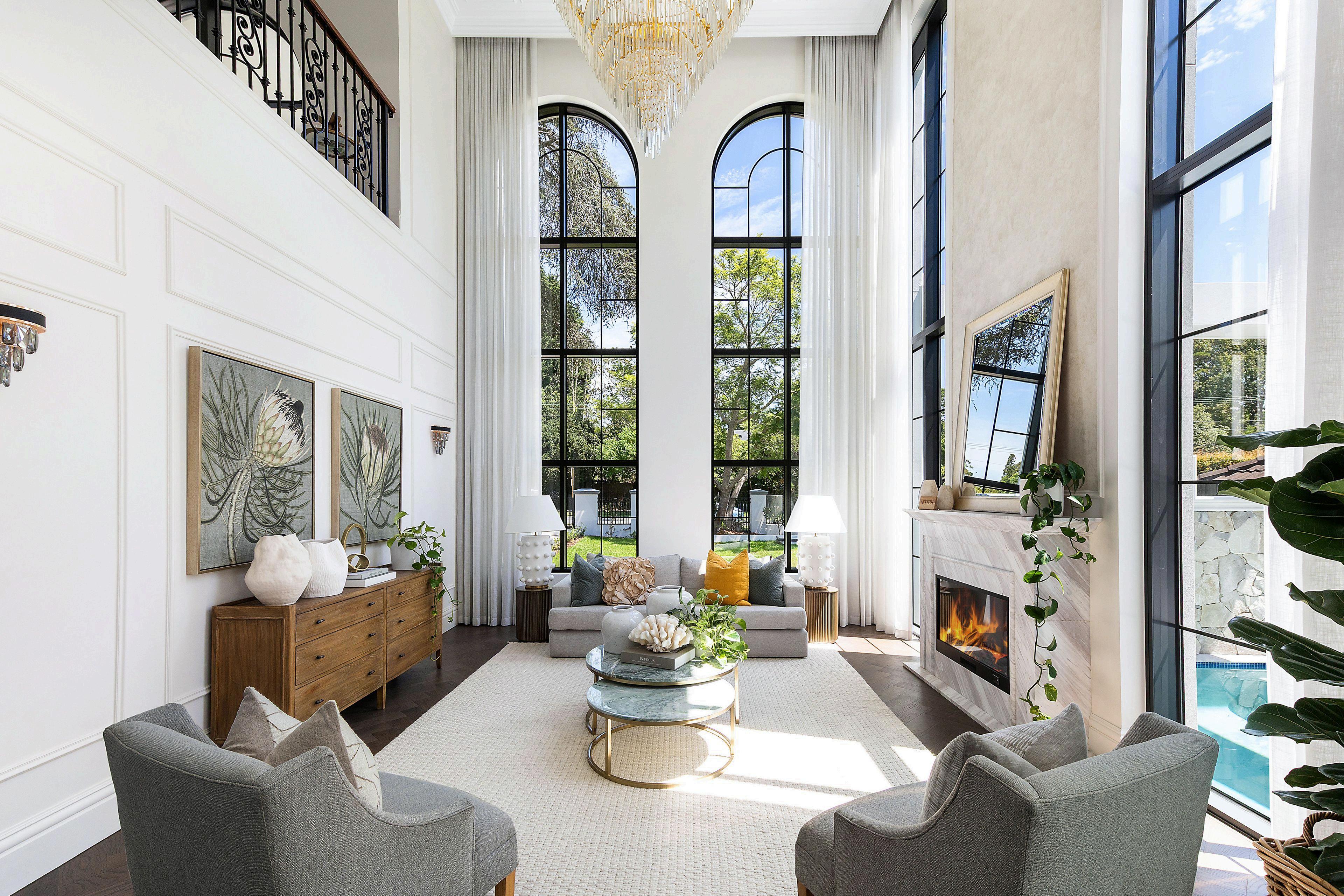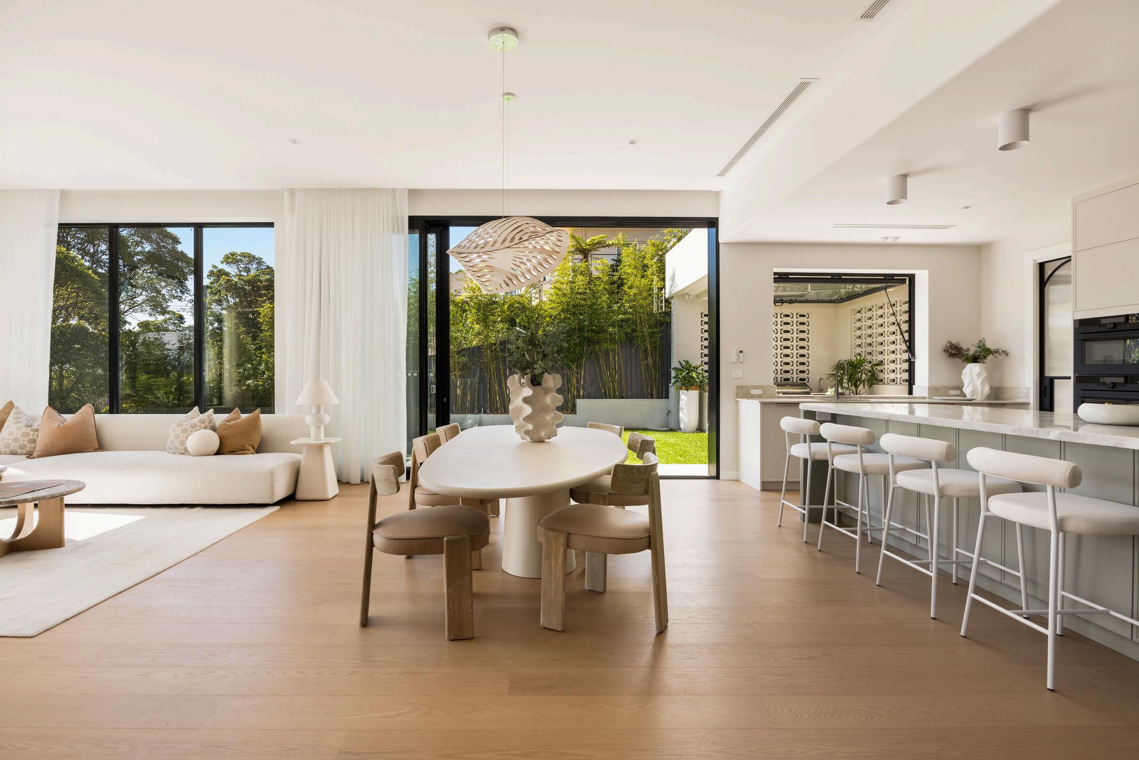 Seamless indoor-outdoor living is elevated by bench-height french windows, opening up to outdoor spaces to facilitate entertaining