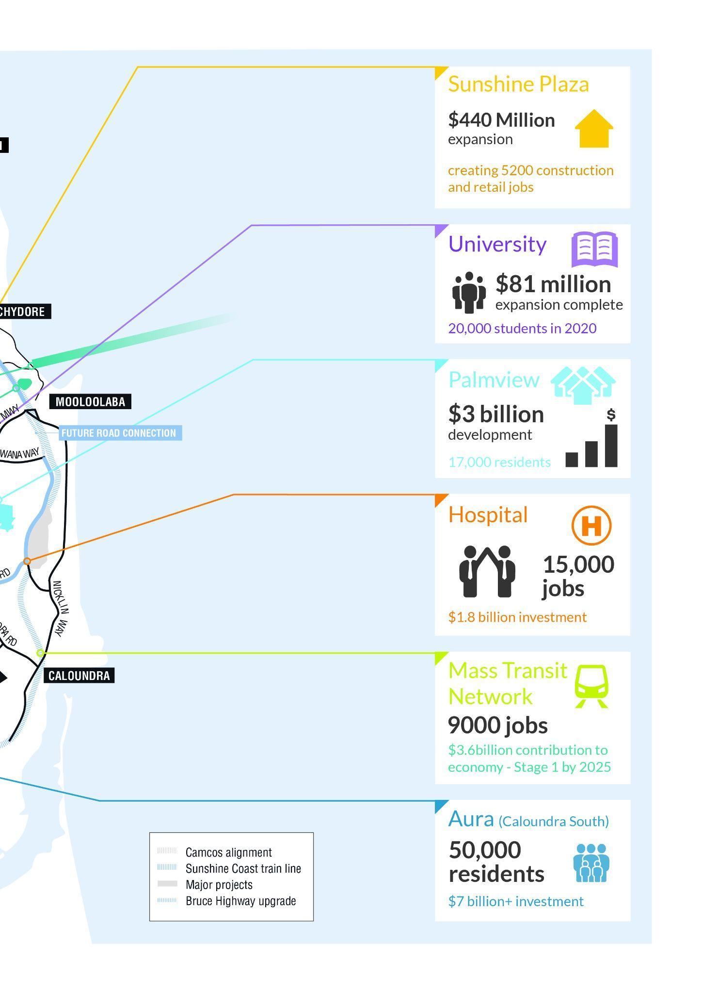 Over the past several years there has been billions of dollarsā worth of investment poured into the region from both the public and private sectors, with projects including airport expansion, the building of the public and private university hospitals and health hub, SunCentral CBD in Maroochydore, the city of Aura in Caloundra South, submarine broadband connection providing fastest connection to Asia from the east coast, Bruce Highway upgrade, multiple new housing estates and associated infrastructure including schools and sporting facilities, industrial parks and more.