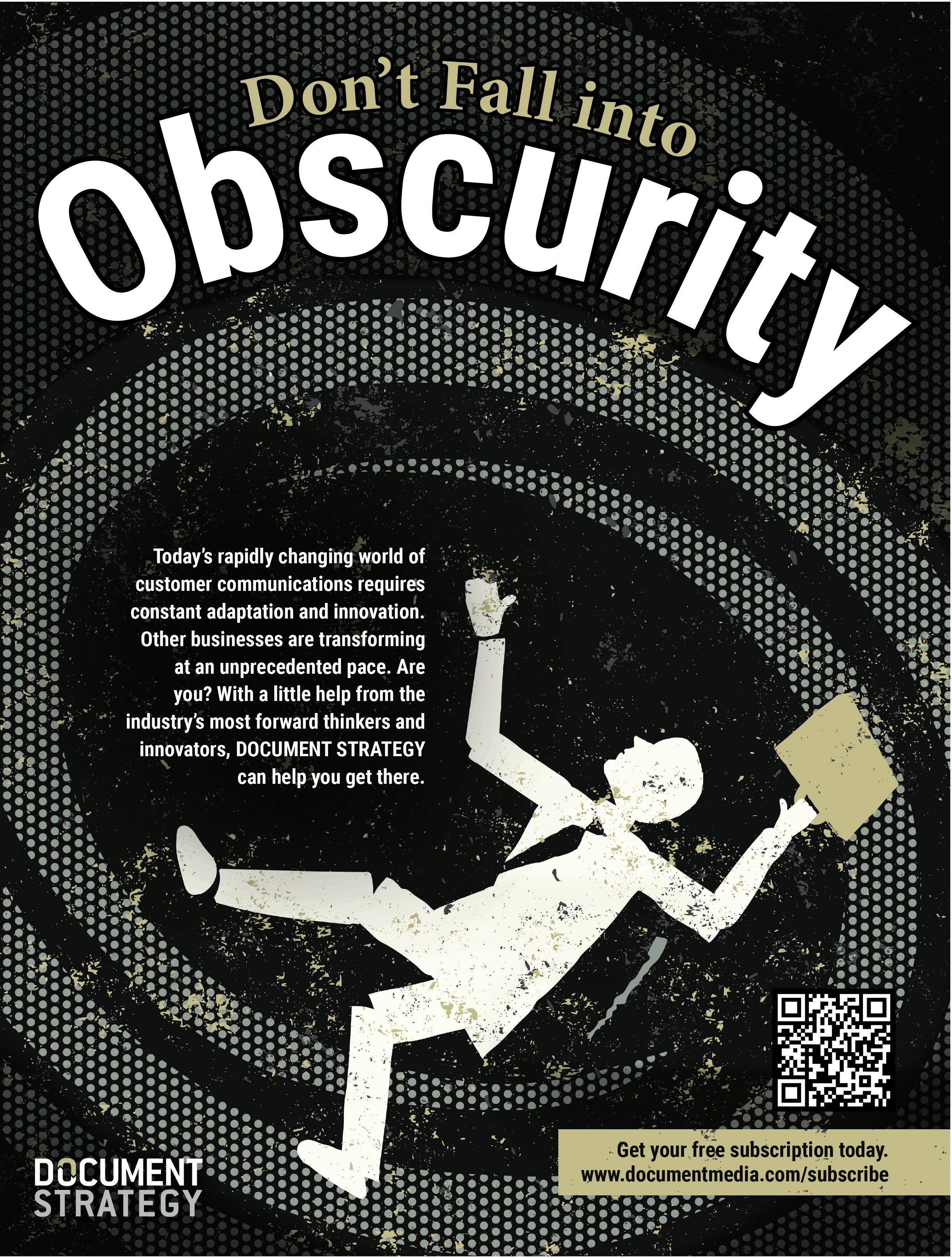 SUBSCRIPTIONS: DOCUMENT Strategy Media is the essential publication for executives, directors, and managers involved in the core areas of Communications, Enterprise Content Management, and Information Management strategies. Free to qualified recipients; subscribe at documentmedia.com/subscribe.