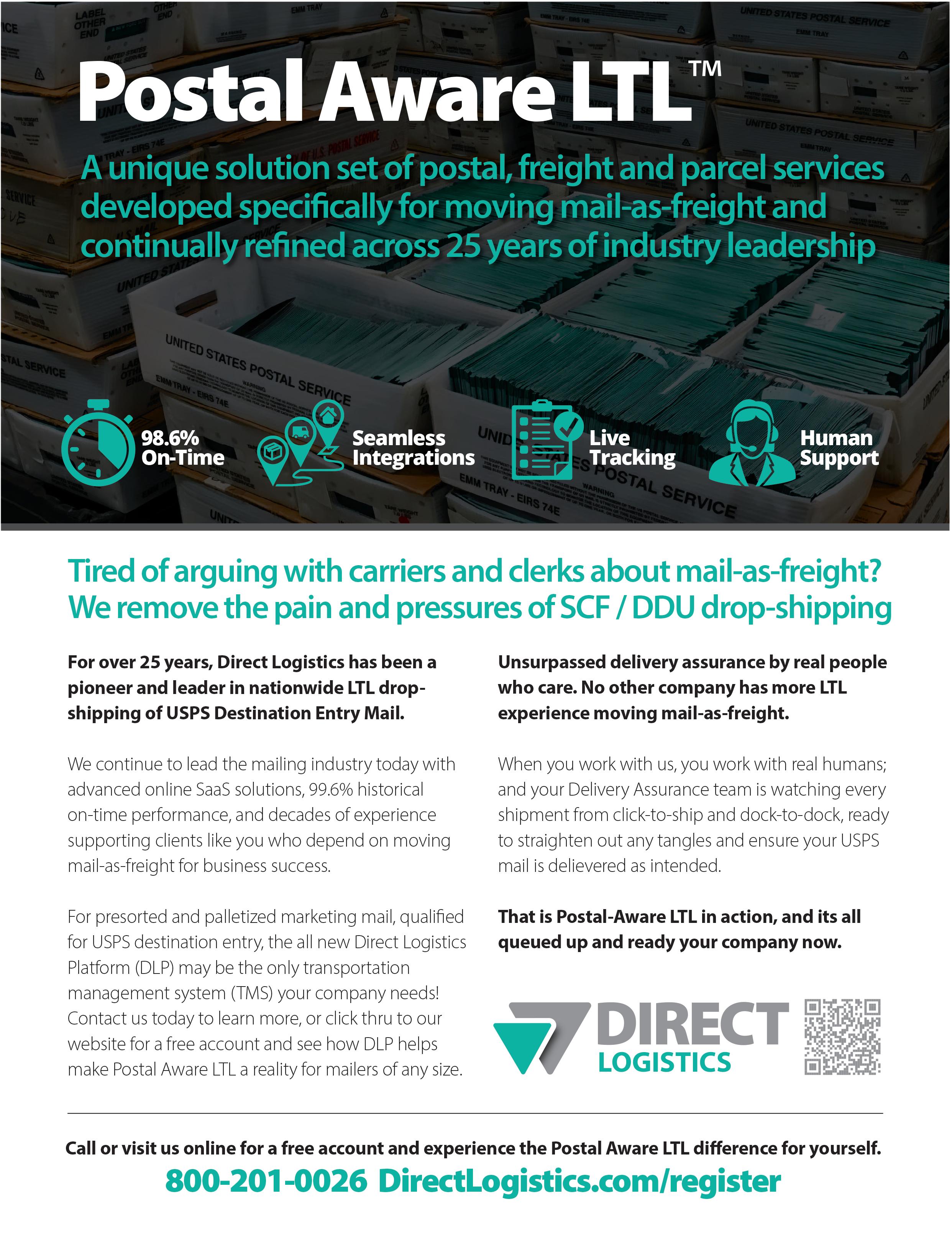 Mail is your business. Shipping palletized mail efficiently is ours. Let’s chat about your LTL and Truckload freight, and where Direct Logistics can make your life easier — and your business more attractive to clients. DirectLogistics.com
