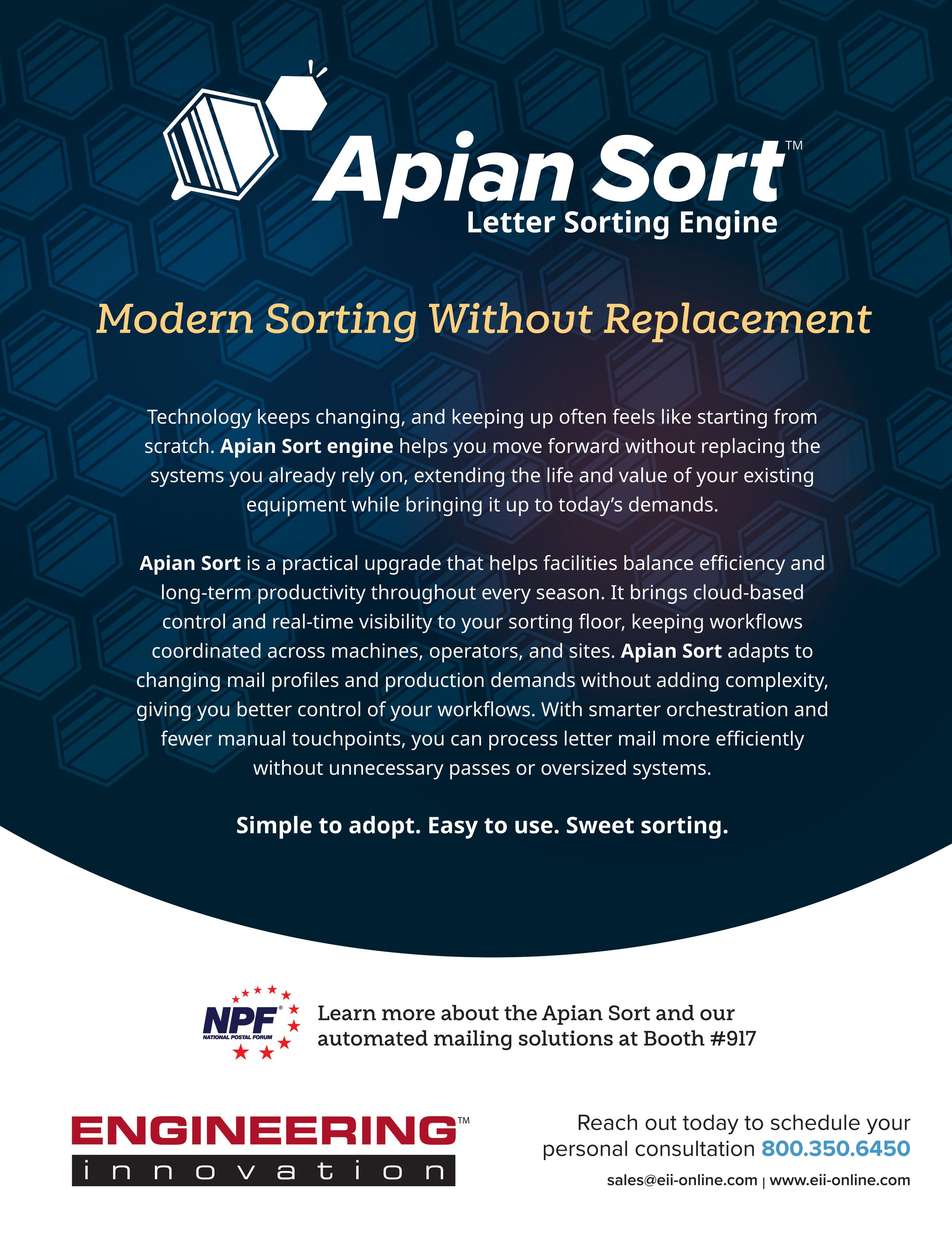 Back by Engineering Innovation’s decades of experience in mail automation, Apian Sort helps organization modernize letter sorting operations while preserving existing equipment investments and supporting future operational growth.