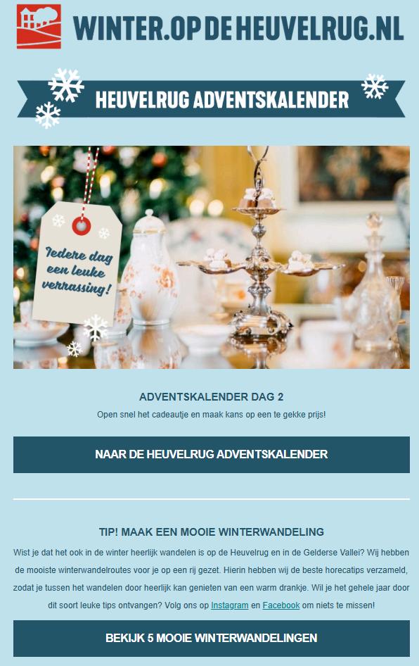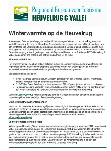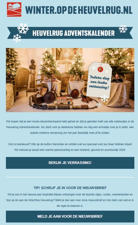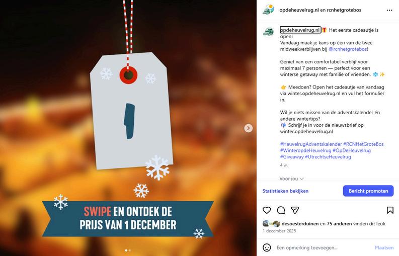 Bewoners en bezoekers van De Utrechtse Heuvelrug: stijlzoeker, harmoniezoeker en inzichtzoeker. Met de Wintercampagne verlengen we het seizoen en bundelen we alle winterse activiteiten en arrangementen op De Utrechtse Heuvelrug. De Heuvelrug Adventskalender is in 2018 gelanceerd en nu een jaarlijks terugkerend onderdeel van deze Wintercampagne. Met de Adventskalender geven we van 1 t/m 24 december de mooiste (lokale) prijzen weg, beschikbaar gesteld door partners. Deelname aan de Wintercampagne is gratis voor partners van RBT Heuvelrug & Vallei.