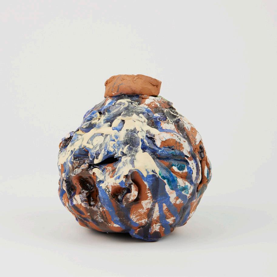 Working within this ceramic lineage, and drawing on craft and historical narratives, my intention has been to challenge the idea of fixed tradition by disrupting and activating form and surface, as a means of storytelling and embodied practice. I worked expressively, and gesturally leaving making marks and the print of the hand to create objects that evoke labour and landscapes, and are bodily in form and expression. Layers of colours insinuate fire, sun, vegetation, night, tropicality, joy, humour and pain, always with the blue of the ocean- absolutely fundamental to diasporic histories.