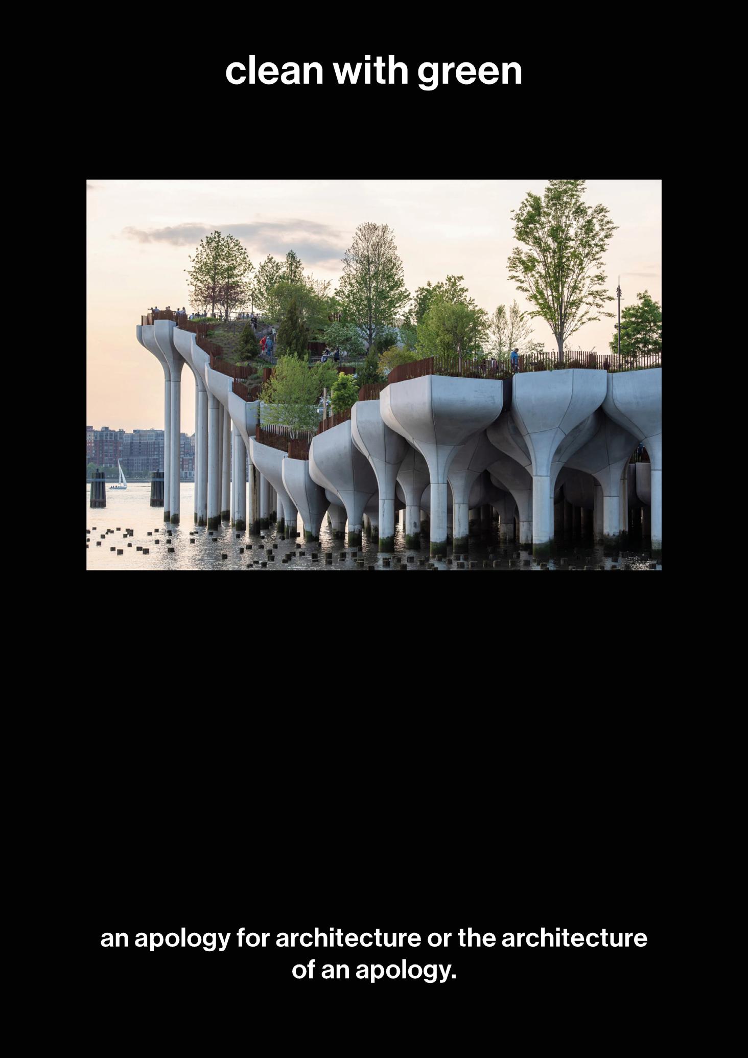 Such is the acceleration and capacity for care-culture today, the apology has expanded into something other than just a text-based performance. Technological accoutrements, sentimental hubris and creative carbon accounting together are constructing an apologetic language to architecture. It is one of rooftop ‘forests’, disjointed façades, aluminium ‘petals’ and nugatory promises. Apologetic architecture exists only to divert attention away from the consequential reality of construction, screened by an image of virtue that compliments the ego of the architect.