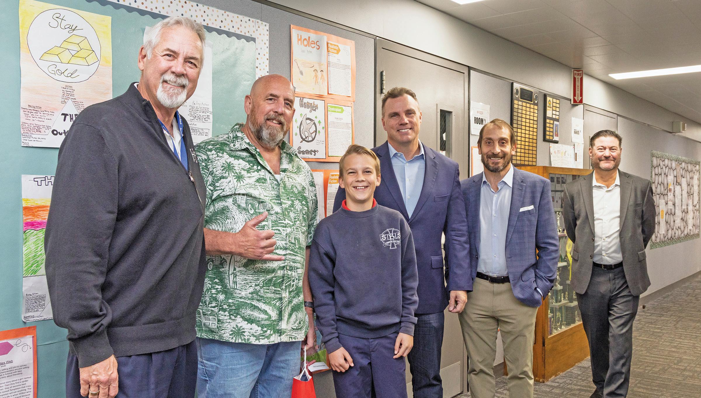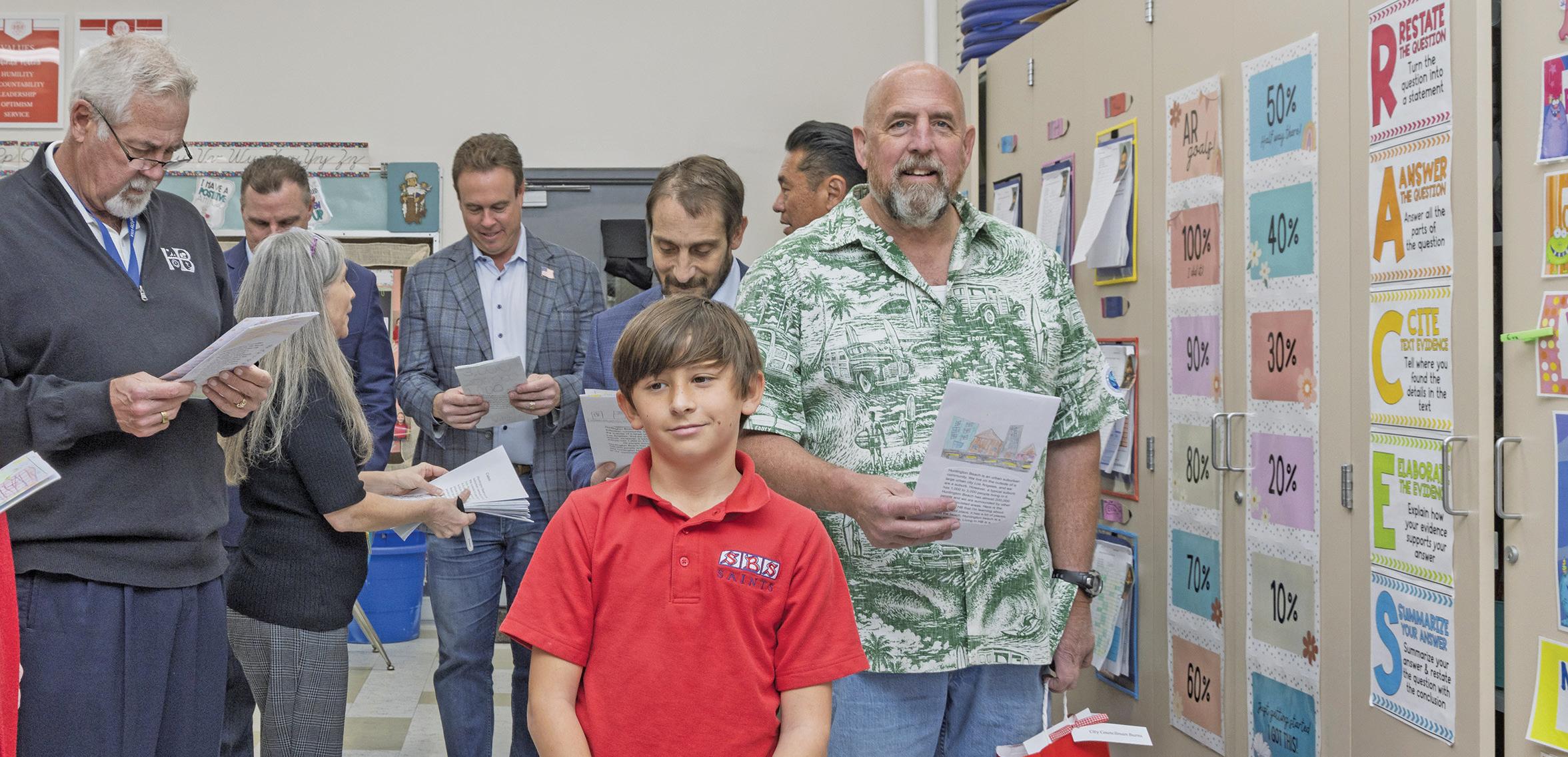 ELI HARRINGTON, A SIXTH-GRADE STUDENT, CENTER, POSES WITH BUTCH TWINING, HUNTINGTON BEACH MAYOR PRO TEM, PAT BURNS, HUNTINGTON BEACH COUNCIL MEMBER, MICHAEL GATES, FORMER CITY ATTORNEY, MIKE VIGLIOTTA, HUNTINGTON BEACH CITY ATTORNEY AND JIM HEANEY, OWNER OF H-WAVE. PHOTO BY ALAN WENDELL/DIOCESE OF ORANGE