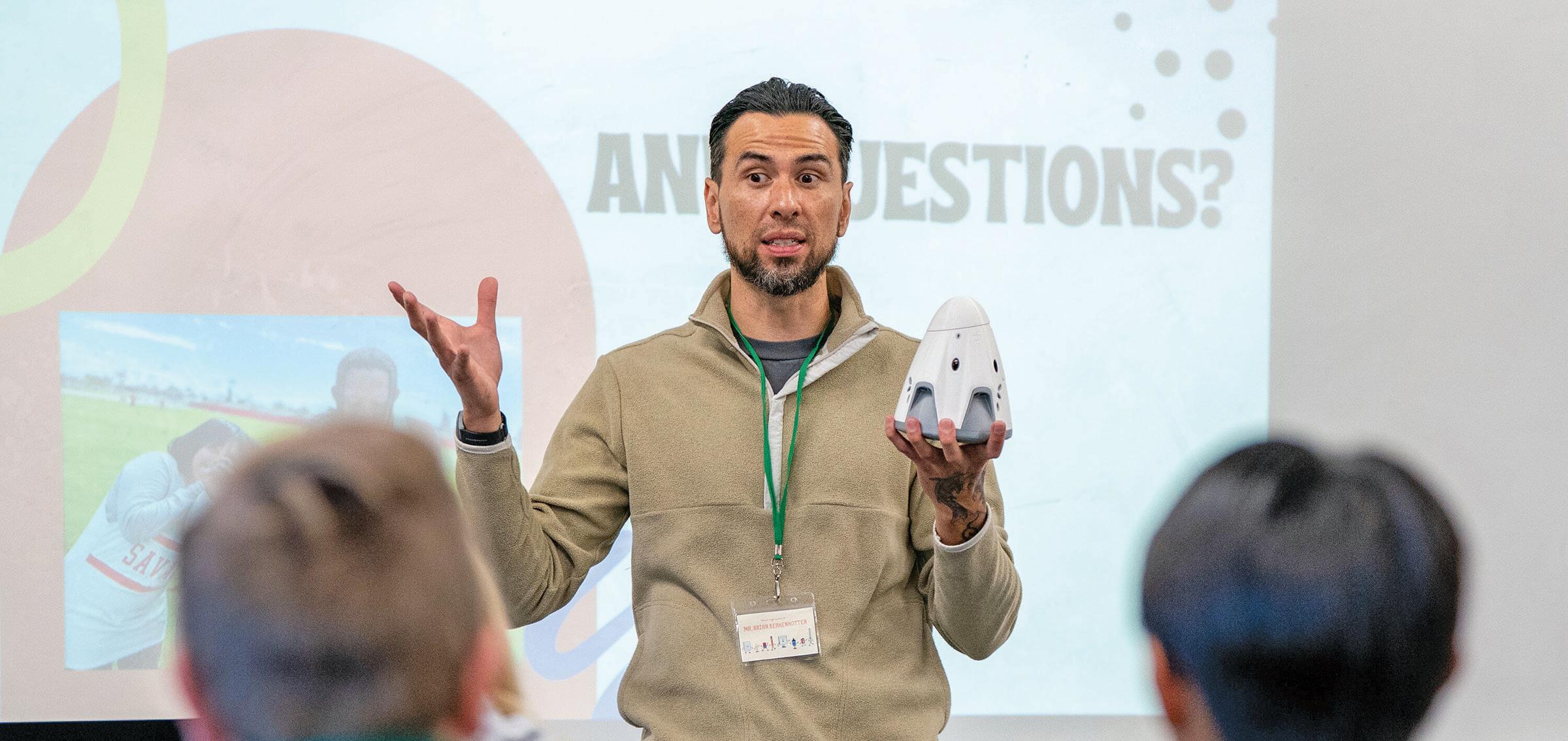 BRIAN BERKENKOTTER, PART OF SPACEX’S TRAINING TEAM, SPEAKS TO A CLASS OF EIGHTH GRADERS DURING ST. HEDWIG CATHOLIC SCHOOL’S SPECIAL PERSONS DAY AND CAREER DAY ON JAN. 23.