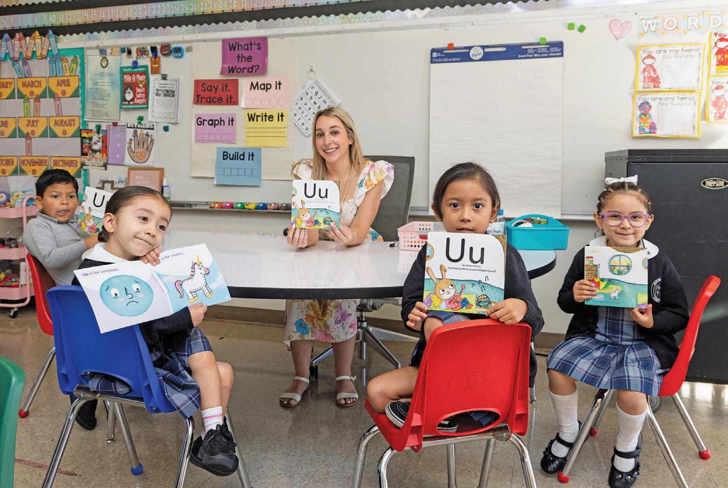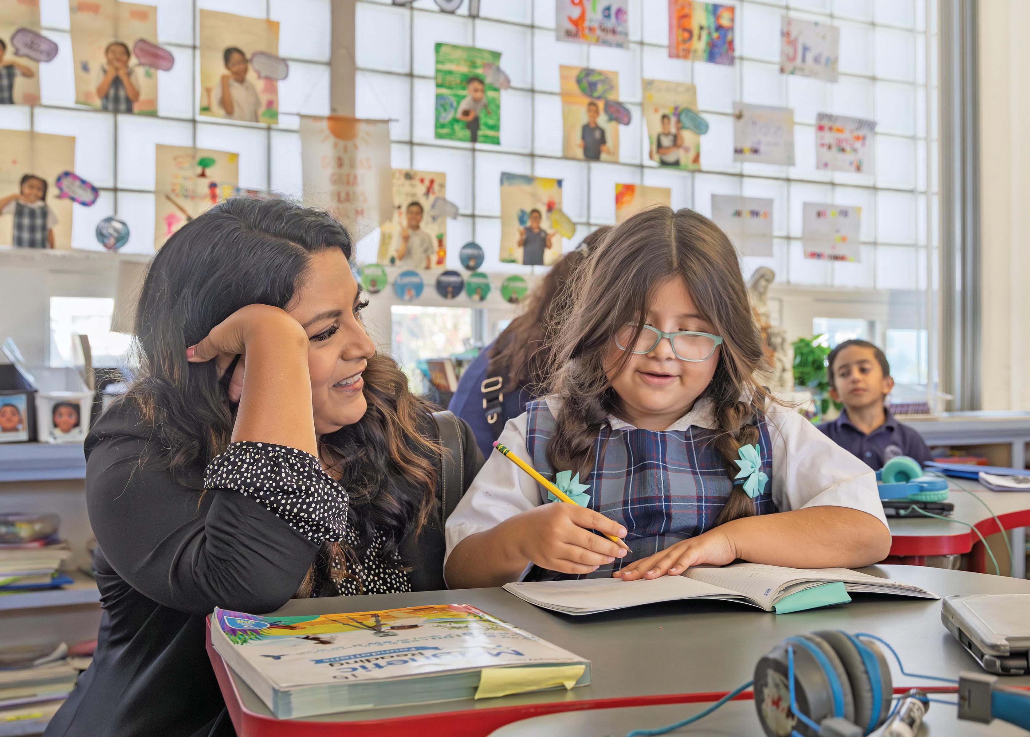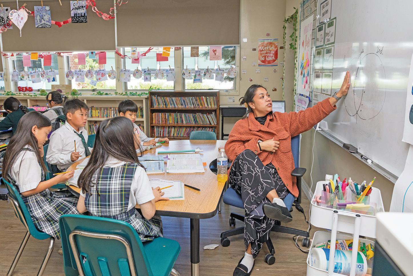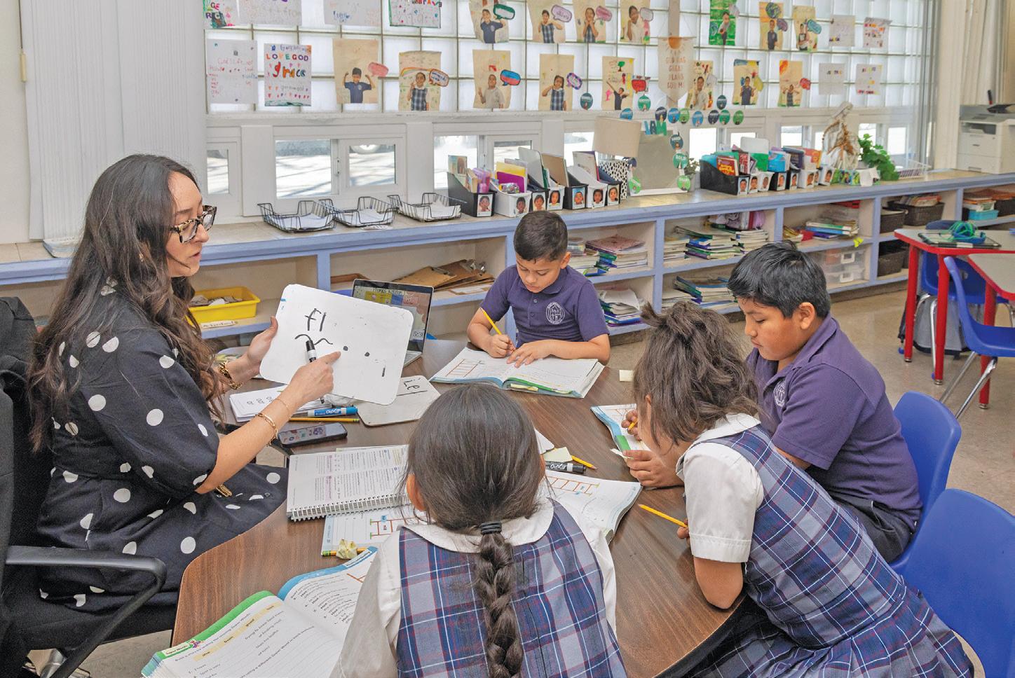 ST. ANNE PARISH SCHOOL’S KARINA HERNANDEZ TEACHES PHONICS TO HER SECOND-GRADE STUDENTS AT A LEARNING STATION.