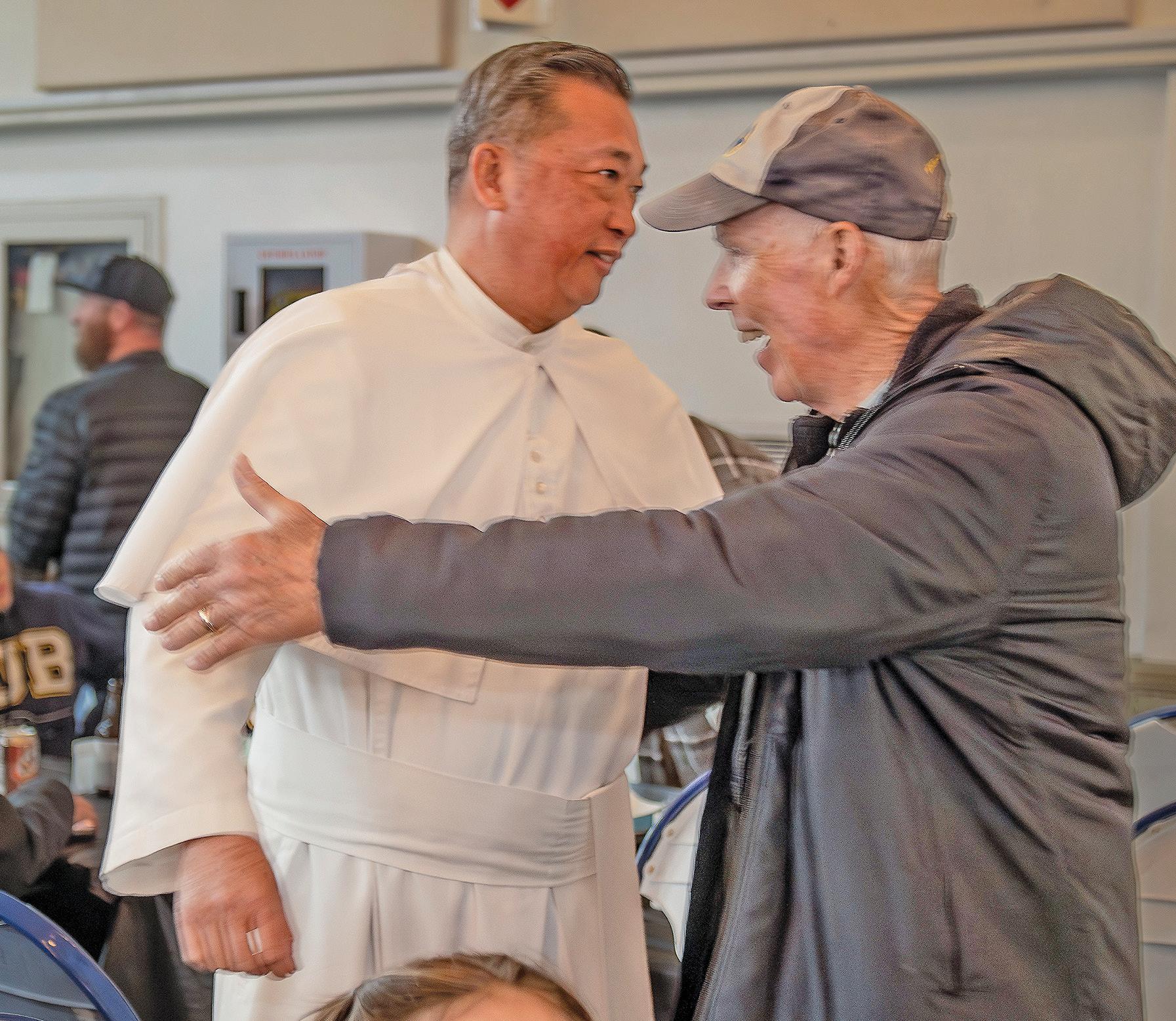FR. PASCAL NGUYEN, LEFT, PASTOR OF ST. JOHN THE BAPTIST CATHOLIC CHURCH, IS GREETED BY PARISHIONER RICK HILLES, 83, RIGHT, DURING THE FEB. 20 FISH FRY.