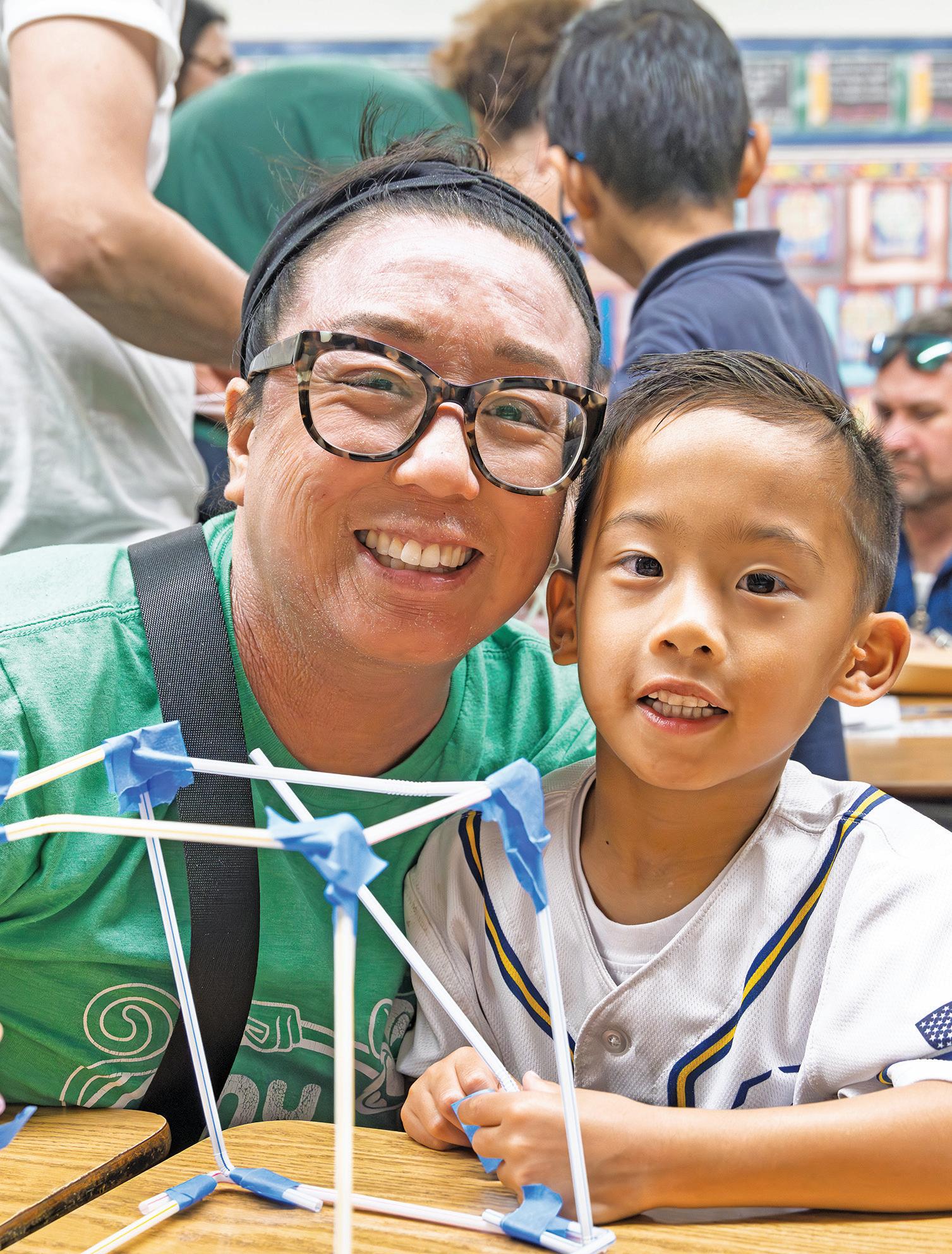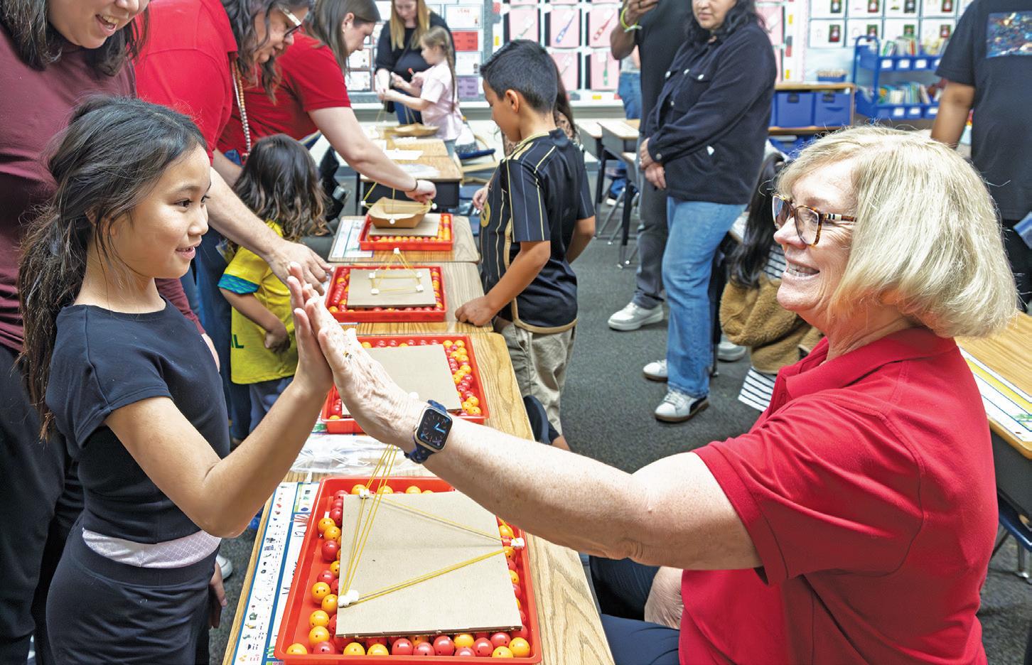 BETH ROJO, A SECOND-GRADE TEACHER, CONGRATULATES A STUDENT ON HER PROJECT DURING STEM NIGHT. PHOTOS BY ALAN WENDELL/DIOCESE OF ORANGE