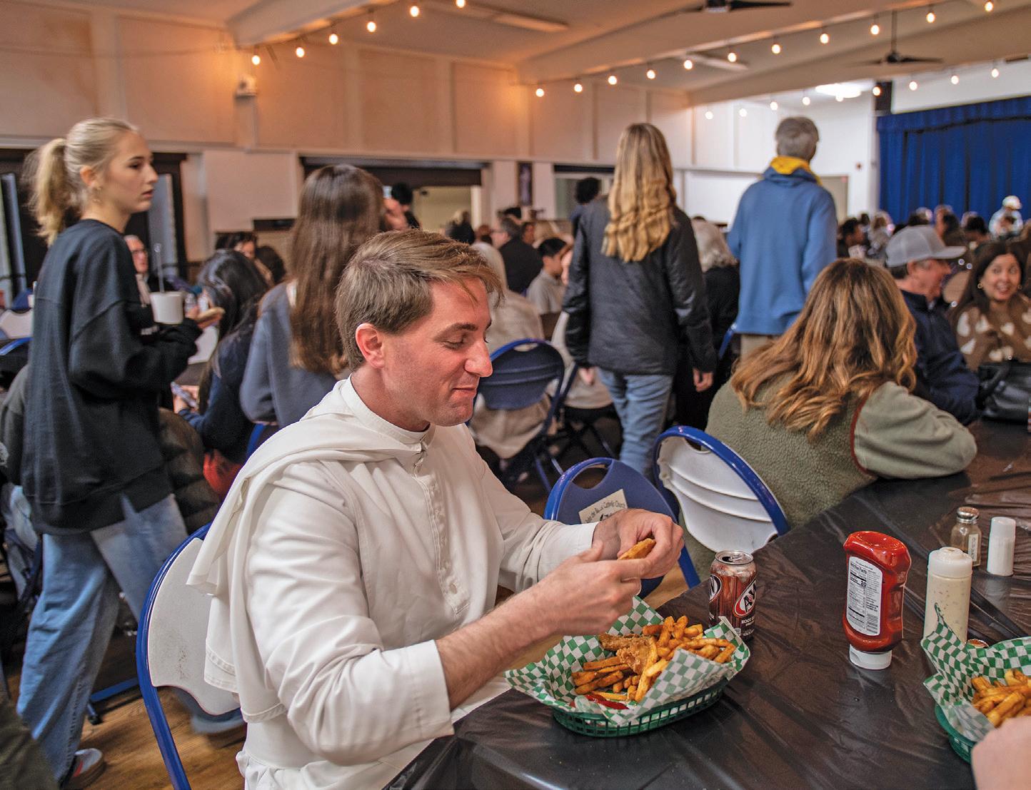FR. LOUIS HAGER ENJOYS HIS FRIED FISH DURING THE FISH FRY. PHOTOS BY JUANITO HOLANDEZ JR./DIOCESE OF ORANGE
