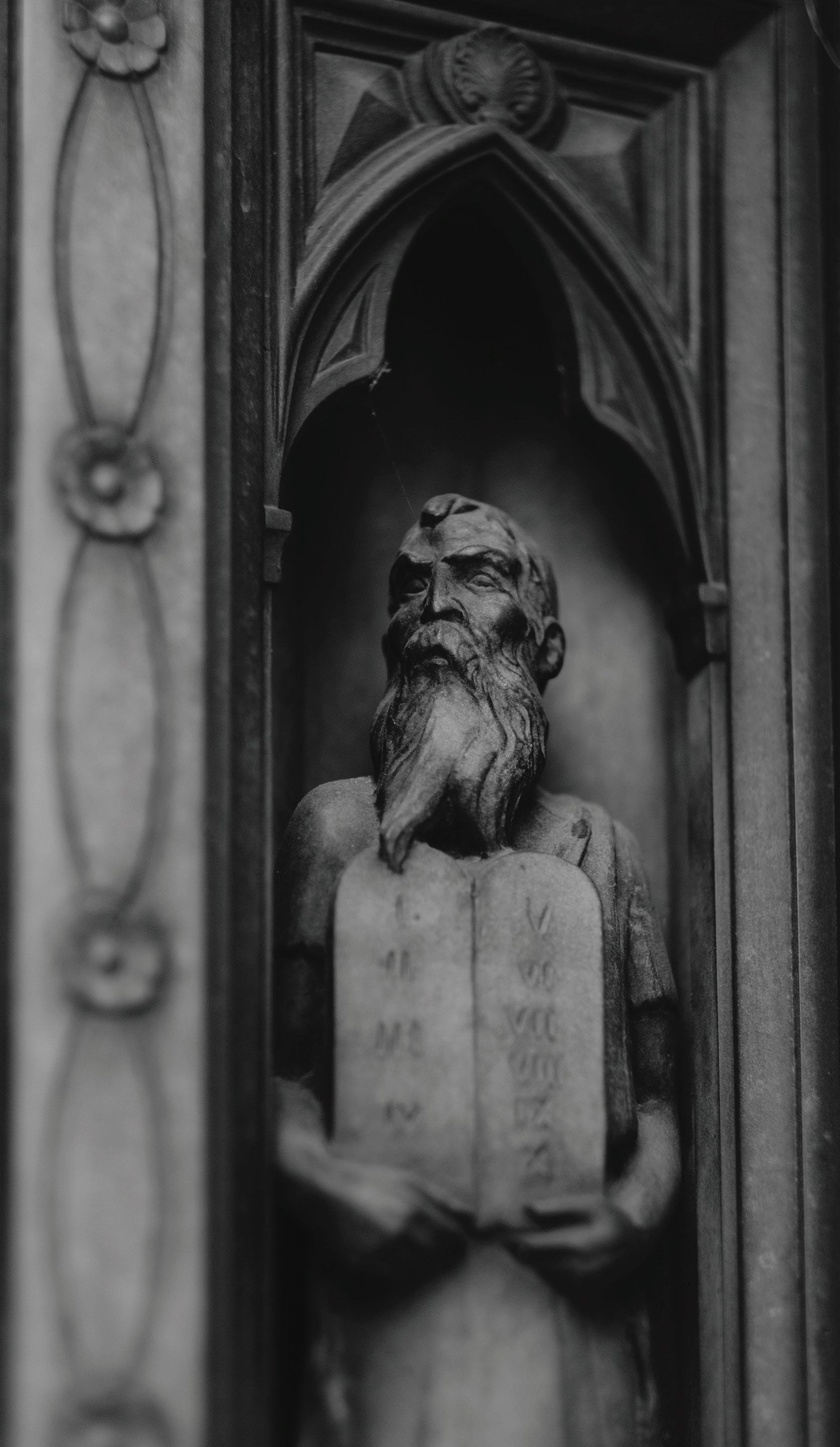 DETALLE DE MOISÉS SOSTENIENDO LAS TABLAS DE LOS DIEZ MANDAMIENTOS, EN UNA PUERTA DEL PARQUE CONMEMORATIVO FOREST LAWN, EN GLENDALE, CALIFORNIA. FOTO DE LEVI MEIR CLANCY EN UNSPLASH
