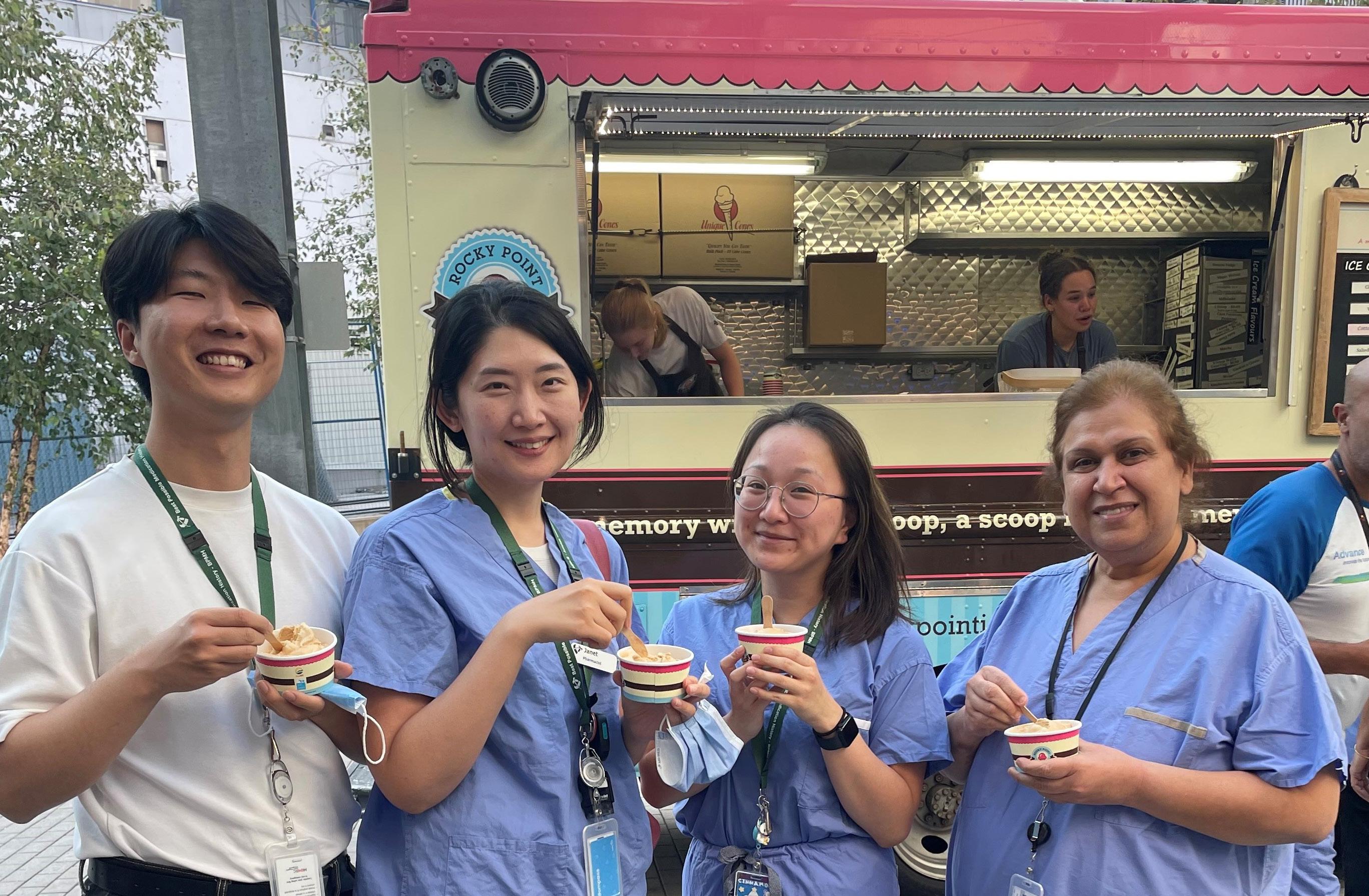 These moments come in many forms, like our quarterly “Cheers to You” celebration, where staff enjoy complimentary food truck meals in a festive atmosphere, or our treat carts that roam the hospital halls with snacks and beverages to brighten busy days.