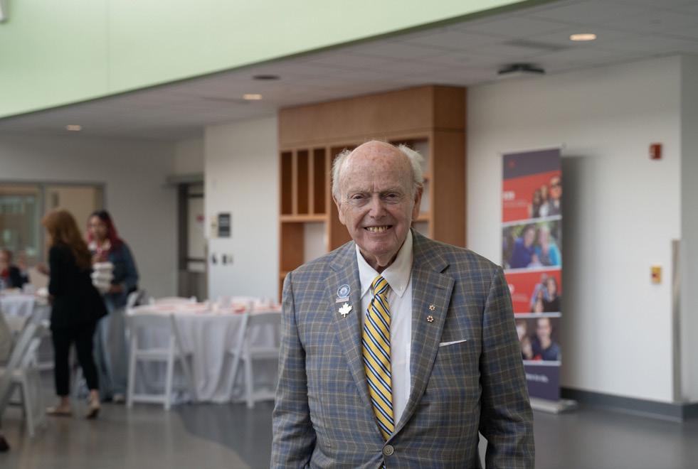 Jim Pattison smiles inside the main lobby of the Jim Pattison Acute Care Tower during the June 17, 2025 signage unveiling, a moment that reflects both gratitude and the promise of care to come.