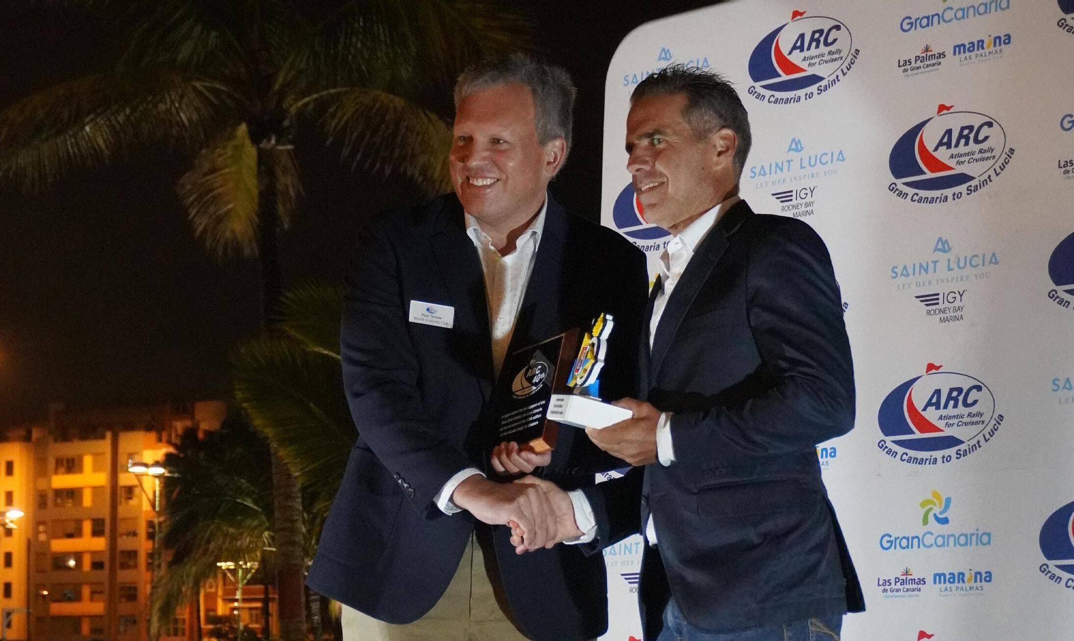 Durante el acto, Paul Tetlow, directivo de la ARC, entregó al comodoro del RCNGC, Gustavo del Castillo, una placa en reconocimiento al apoyo histórico que el Club brinda a esta regata desde el Puerto de Las Palmas, junto a la Armada. El RCNGC correspondió con un trofeo simbólico en honor a la estrecha colaboración que mantiene con la organización del rally oceánico.