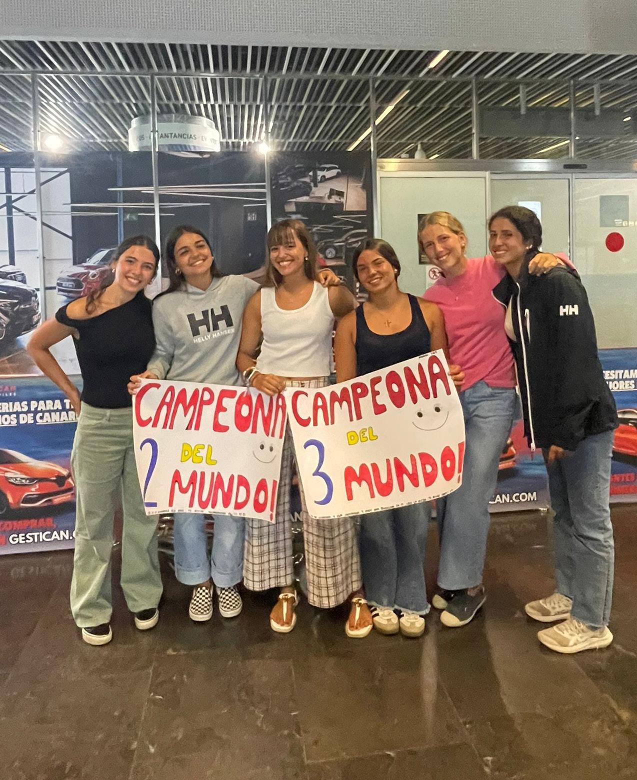 De izquierda a derecha: Lucia Martin, Alejandra Lopez-Amado, Inés Martín-Urda, Martina Bárbara, Catalina Feliu y Beatriz Arencibia. A la derecha Isidro, entrenador del equipo, Alejandra y Martina celebrando la victoria en Gales. Georgi Altham.