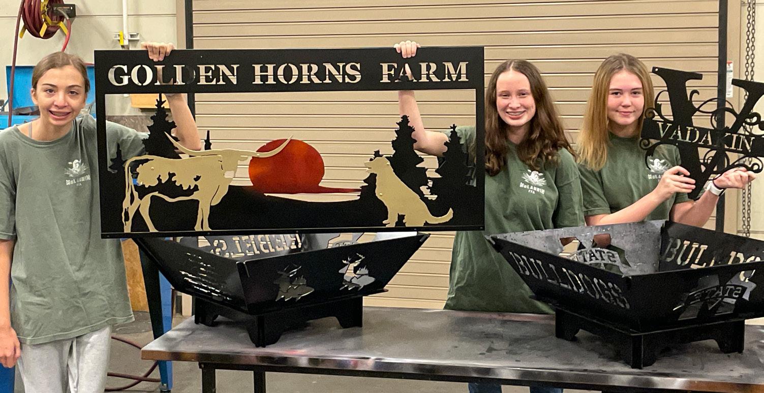 From left to right: McLaurin High School (Rankin County School District) freshmen Abby Harper, Ava Welch and Chloe Morris pose with metal fire pits and decorations fabricated at the school this winter Agriculture students designed and produced metal goods they then sold to help offset the costs of field trips and supplies� The three students were enrolled in the school’s Introduction to Agriculture class