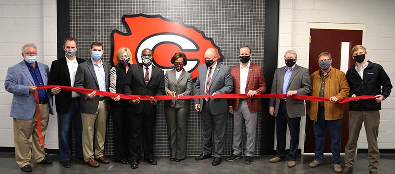Bottom: Officials cut a ceremonial red ribbon during the CHS open house event in December. Pictured from left to right are architect Gary Bailey, Derek Holmes, Matt Thomas, Paula DeYoung, Bernard Kines, Felicia Gavin, Clinton Public School District (CPSD) Superintendent Tim Martin, Brett Robinson, CPSD CTE Director Bill Hardin and Brad and Jamie Fountain of Fountain Construction.