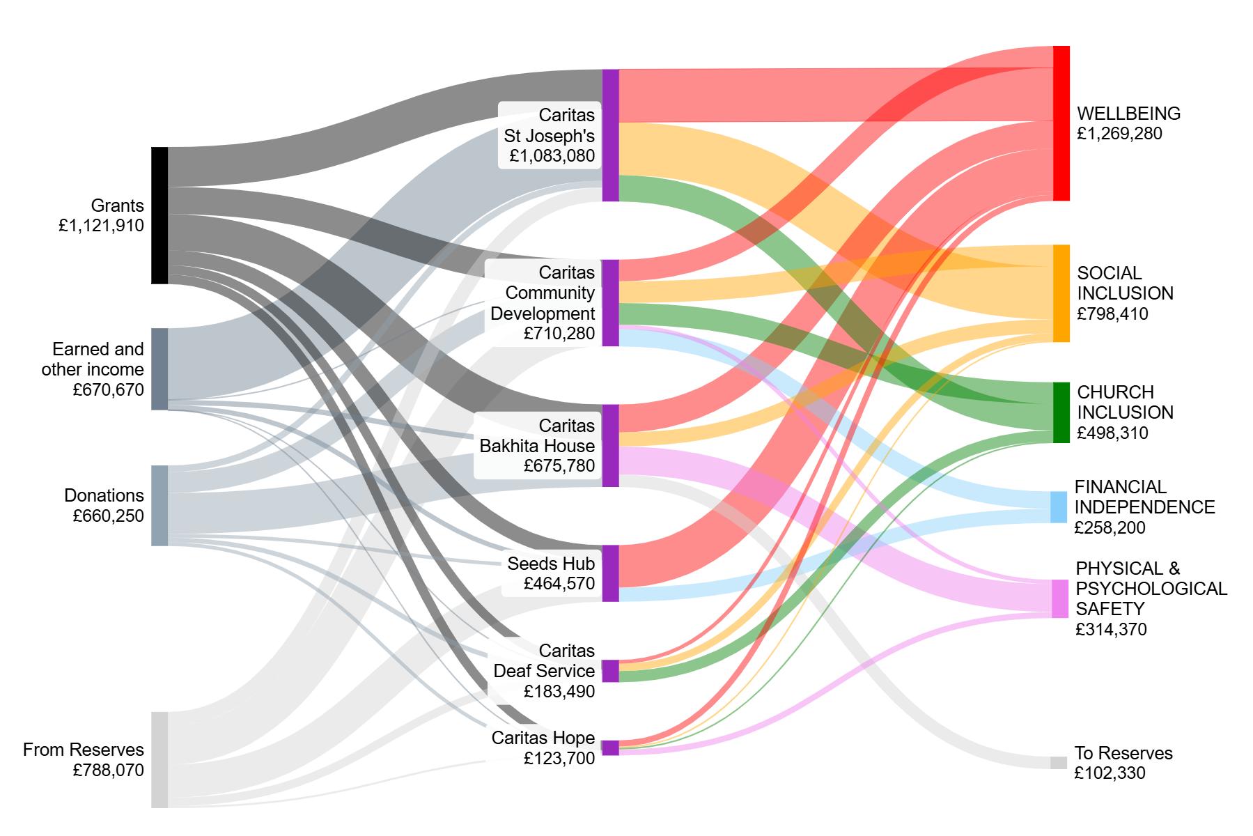 Income raised for Caritas Community Development amounted to £0.4m, requiring a £0.3m drawdown from reserves to deliver planned services during the year. Similarly, a number of other services — including Caritas Deaf Service, Safe in Faith (which in 2026 will be incorporated into our new service, ‘Caritas Hope’), and Seeds Hub — required reserve support to meet their commitments.