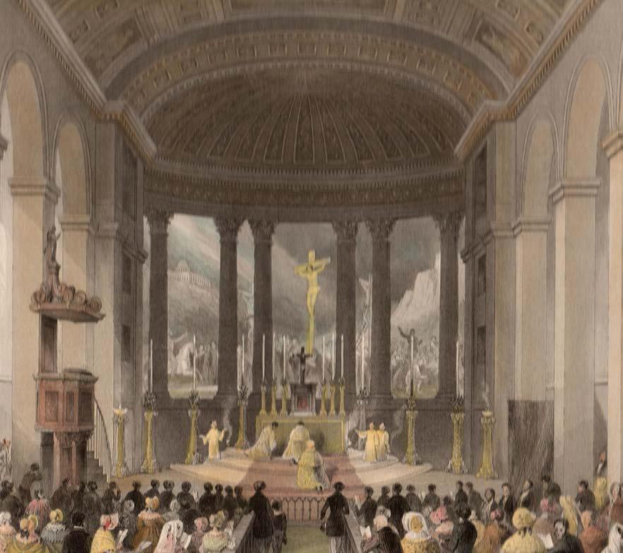 When, in 1791, chapel-building and the public celebration of Mass were legalised, a church opened in White Street, Moorfields. Four priests served a huge parish, embracing a large area of London in addition to the City, with numerous prisons, hospitals and workhouses – a truly enormous workload. However, it was thought too small, and in too inconvenient a location, to represent Catholicism adequately, and, in 1816, a campaign was launched to replace it with a larger church in Finsbury Circus, better suited to showcasing the Catholic Faith and Liturgy in a suitably imposing manner. The cost of building was raised by public subscription, and work started in 1817.