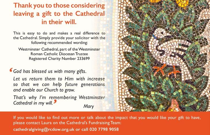 Opinions expressed by contributors do not necessarily represent the views of the Editor or the Oremus Team. Neither are they the o cial views of Westminster Cathedral. e Editor reserves the right to edit all contributions. Publication of advertisements does not imply any form of recommendation or endorsement. Unless otherwise stated, photographs are published under a creative commons or similar licence. Every e ort is made to credit all images. No part of this publication may be reproduced without permission.