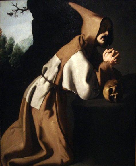 Some of it shocked a British audience: the realistic sculpture of Christ dead in the tomb, covered with wounds and blood, by Gregorio Fernández, or the halflength Man of Sorrows showing Christ a er his scourging, by Pedro de Mena. But it was obvious a er that exhibition that polychrome statuary could not be dismissed as bad taste or t only for dark side chapels of foreign churches. Of course, even though thousands saw that exhibition, they remained a small minority of the nation. But the default attitude had changed: the religion that this art re ected had to be taken seriously. at exhibition in 2009 included a statue of St Francis of Assisi standing in meditation, by Pedro de Mena, and it also showed the extraordinary painting, 5 high, of St Francis kneeling in meditation, by Francisco de Zurbarán. It is on permanent display in the National Gallery, but perhaps o en gets overlooked for that reason. is painting was the star exhibit (apart from one which I shall mention later) at the St Francis of Assisi exhibition 14 years later. It was worth seeing in reality, because no reproduction of it can do justice, for example, to the shaded face just discernible within the deep frame of the cowl. Zurbarán is celebrated for his representation of textiles, and here the patched habit of the poverello, the man of poverty, is depicted in a setting without details, promoting a sense of tranquillity and detachment from the world.