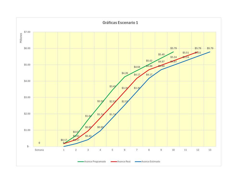 Bajo este concepto, se llevó a cabo una simulación de un proyecto de construcción programado para 10 semanas, con un retraso de 2 semanas Se calcularon estimaciones y erogaciones, además de crear gráficos para comparar el avance en diferentes escenarios.