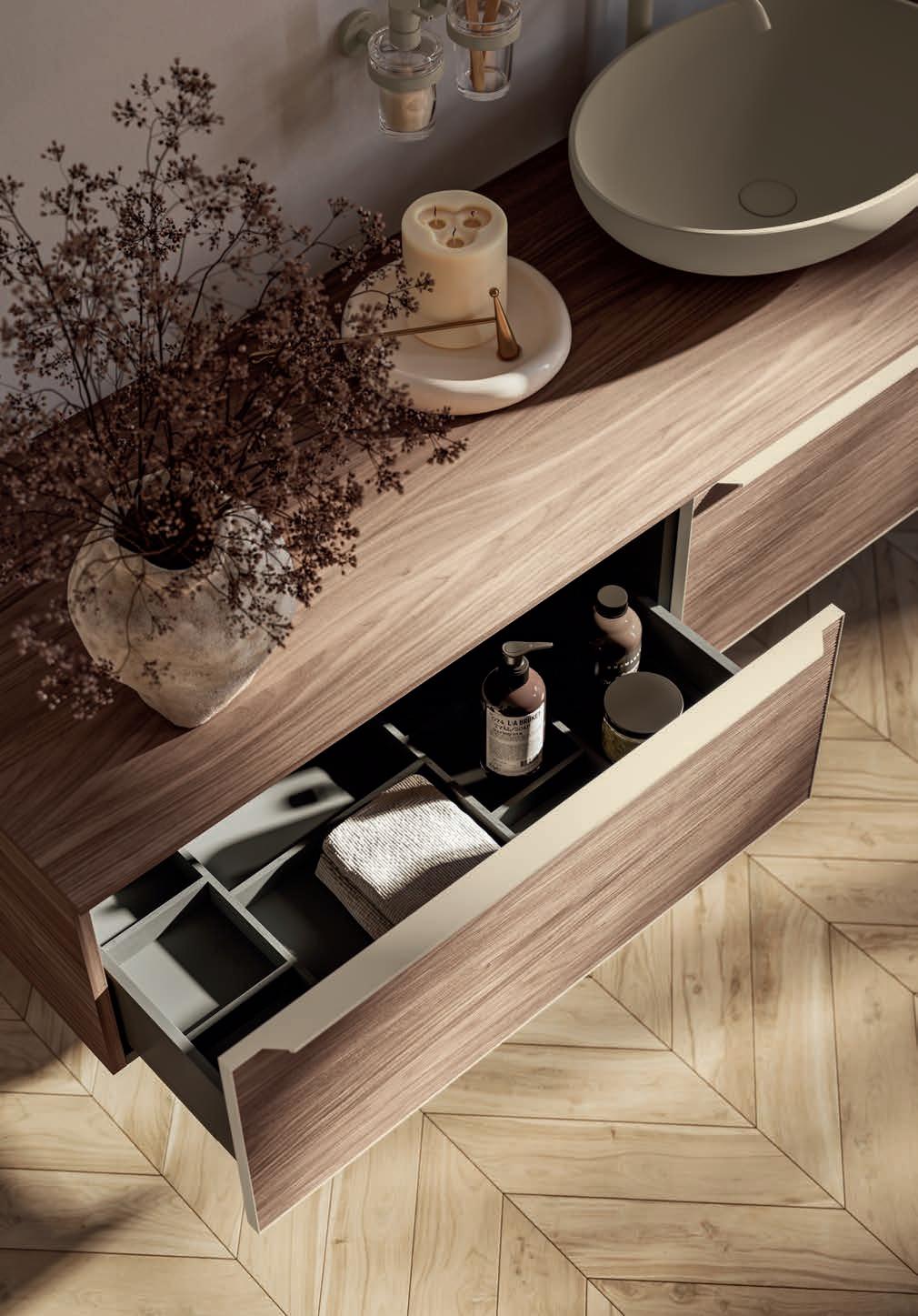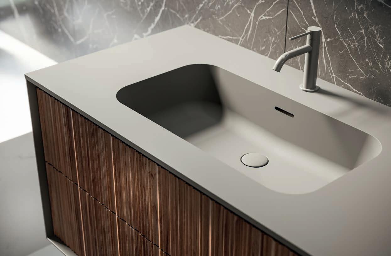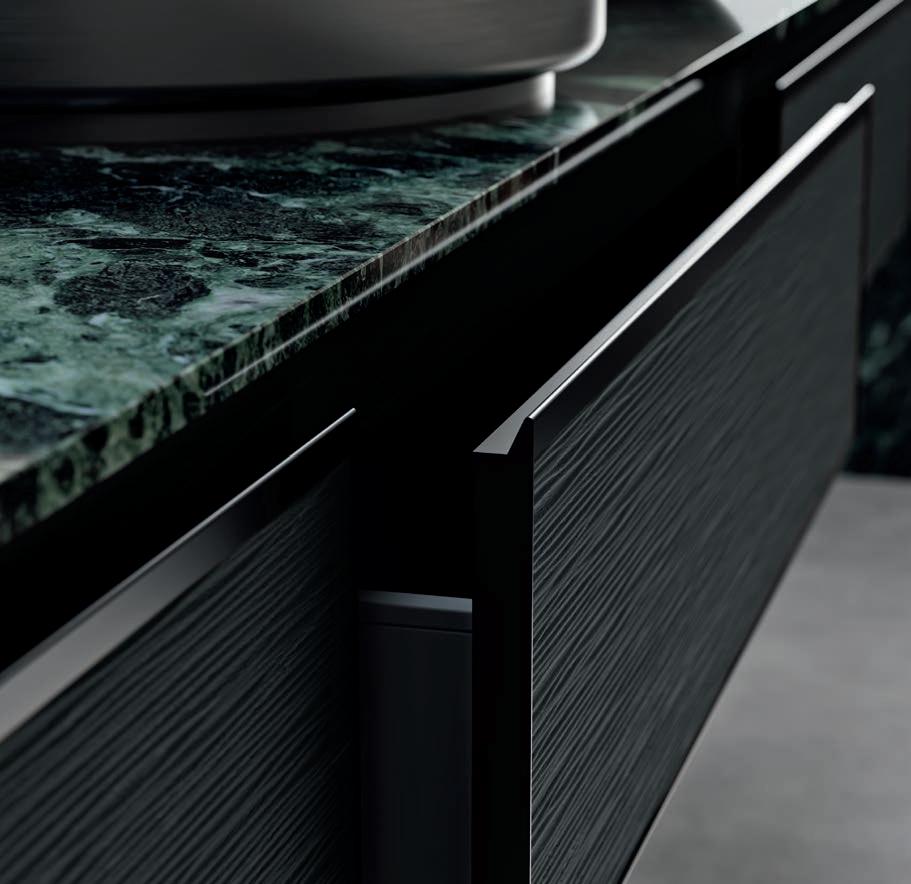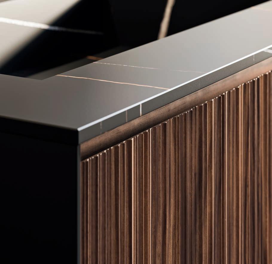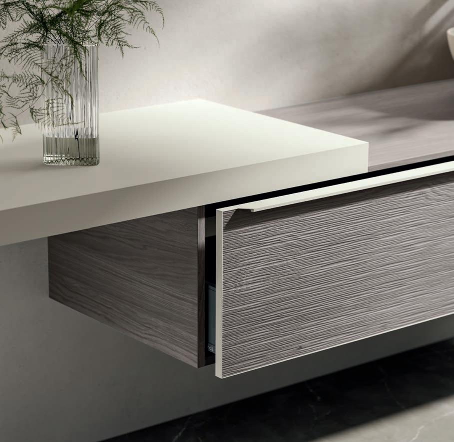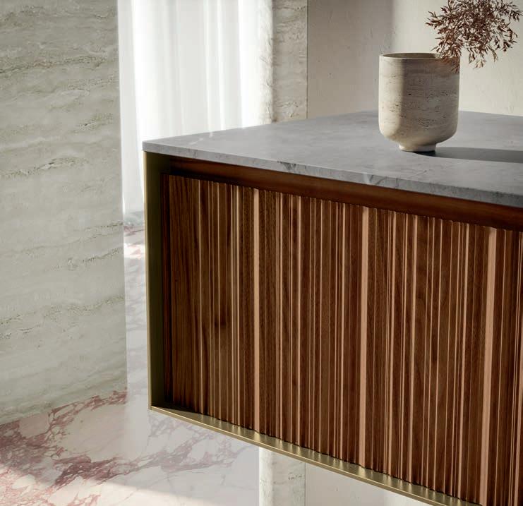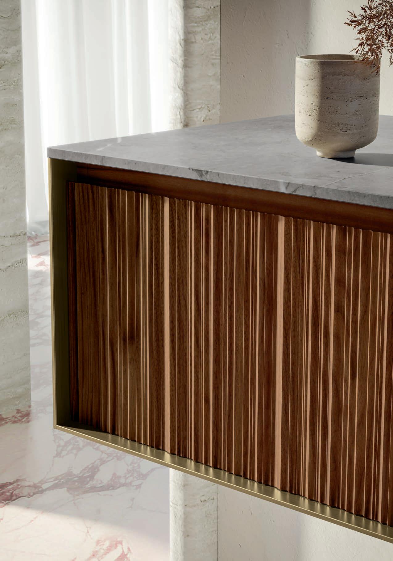 A visually impactful cladding, coating of two side panels and a bottom one, available in a wide range of finishes. Combined with the countertop, it creates a visual frame that embraces the entire composition.