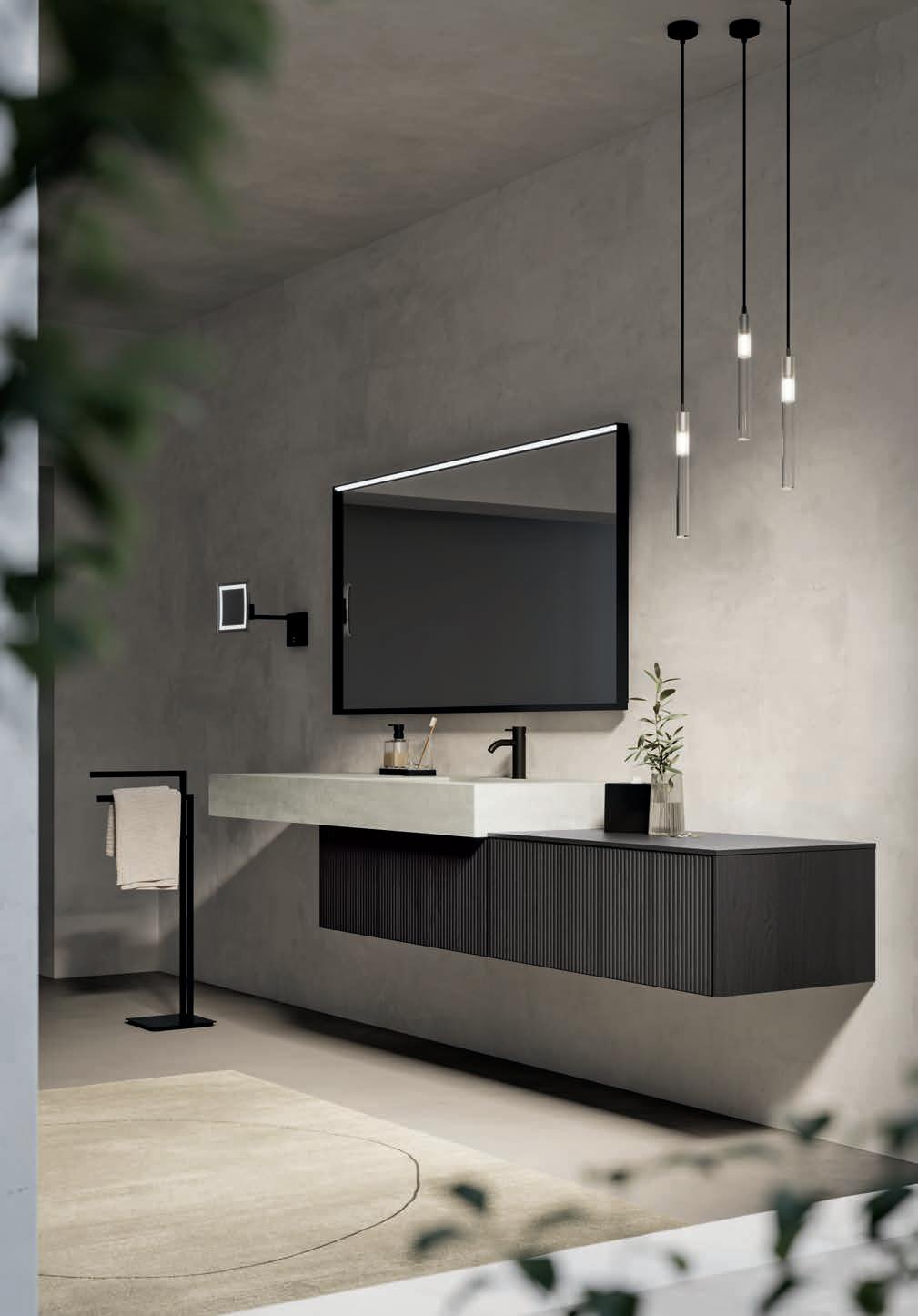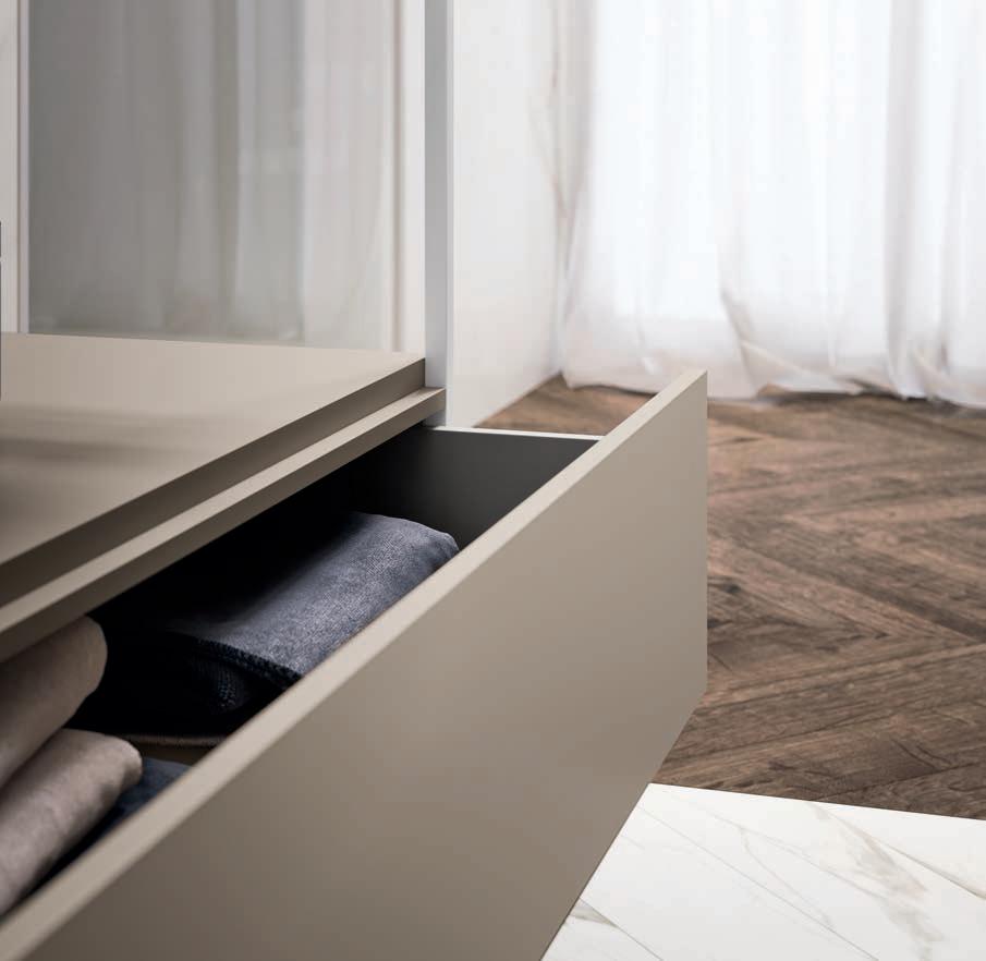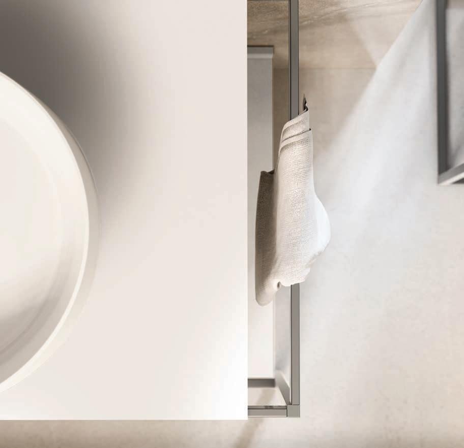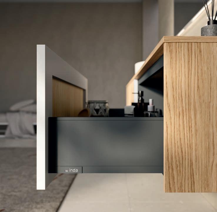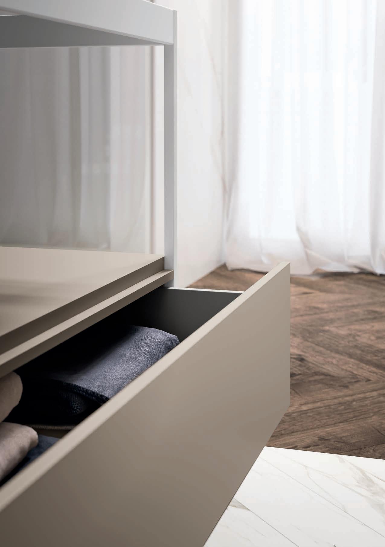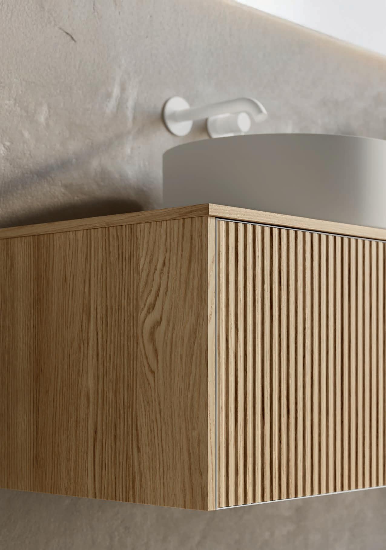 A visually impactful cladding, coating of two side panels and a bottom one, available in a wide range of finishes. Combined with the countertop, it creates a visual frame that embraces the entire composition.